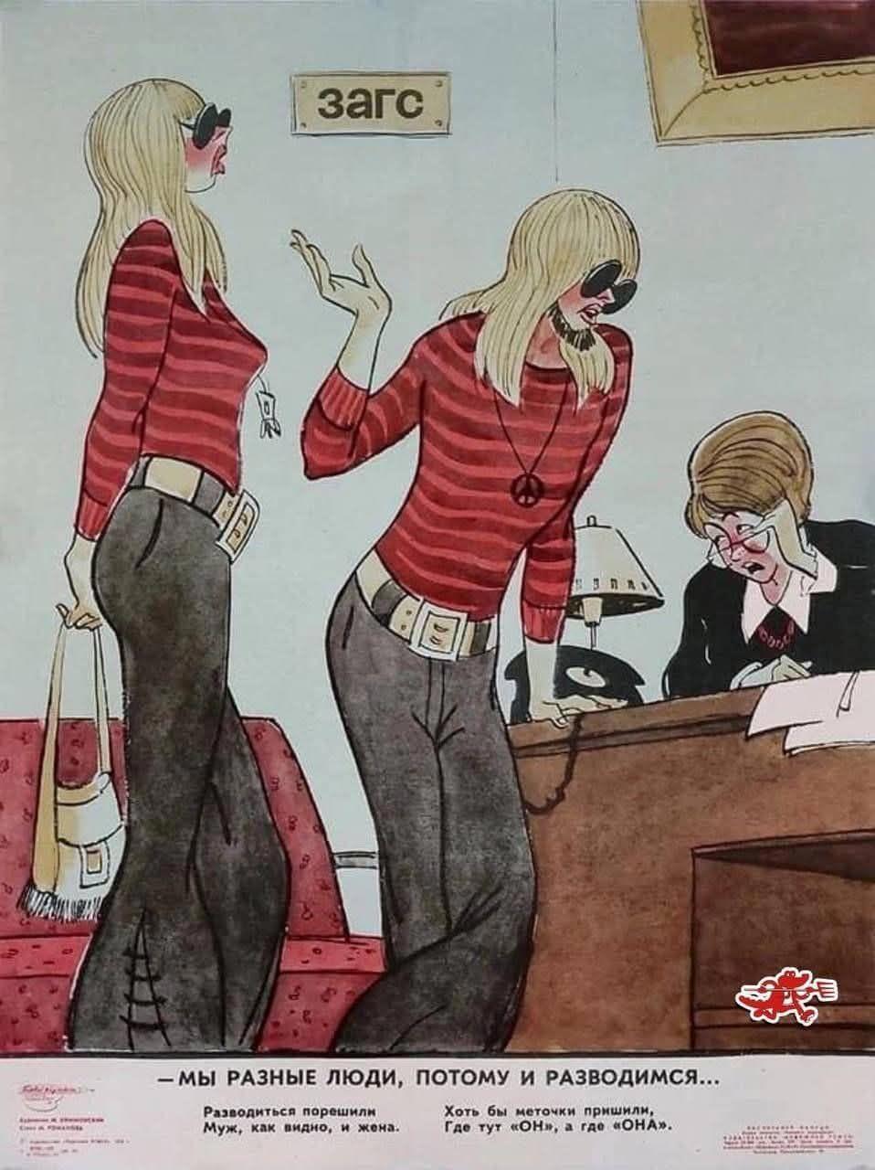 Автор: Рэйда ЛиннНекоторое время назад мне попалась вот эта советская карикатура с двумя одинаково одетыми андрогинными людьми, которые решили развестись. У длинноволосого мужчины на груди висит пацифика.