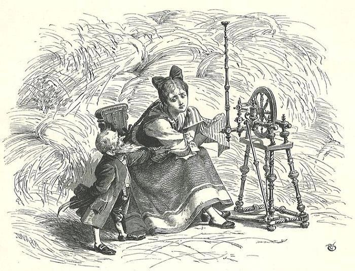 Немецкая сказка братьев Гримм о злом карлике, способном создавать золото из соломы, прядя ее.
