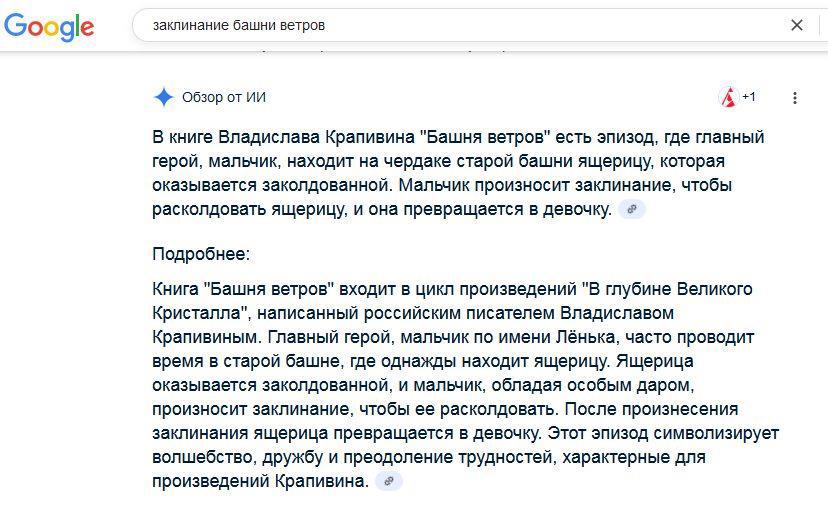 И вот мне понадобилось найти упоминания о нем в интернете. Для атмосферы таинственности вбил запрос "заклинание башни ветров". И вот что мне ИИ Гугла выдал: