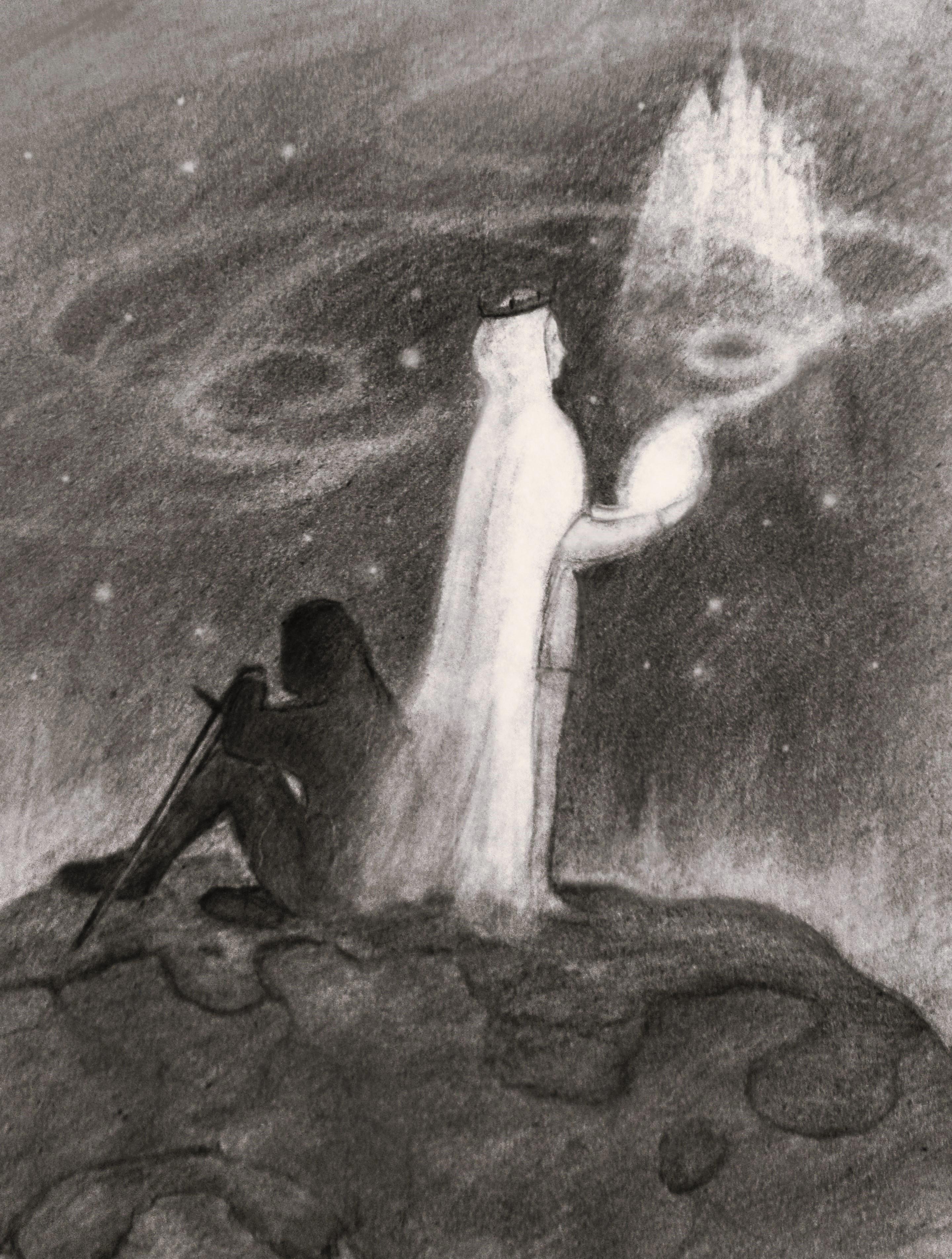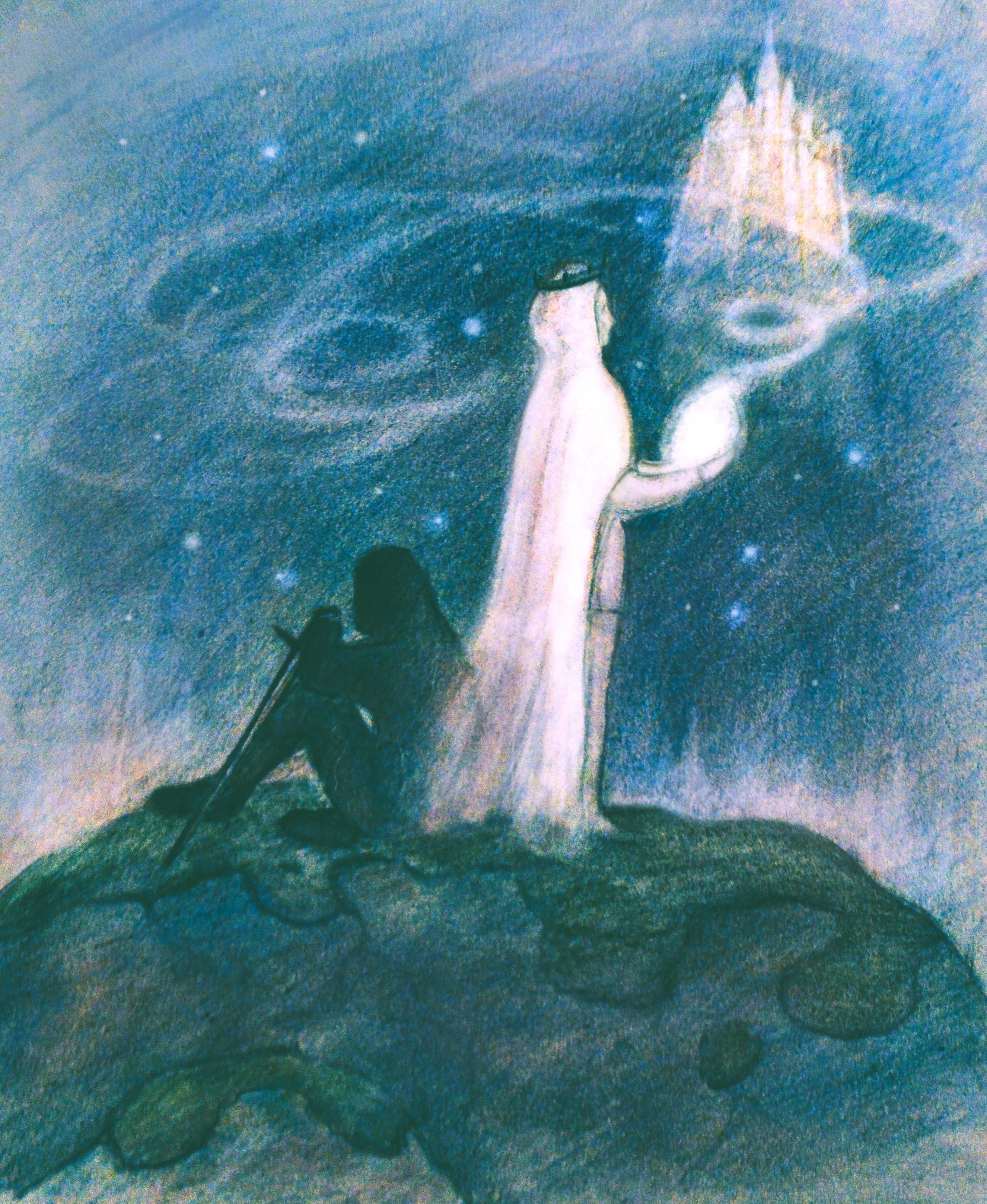 Цвет, конечно, фотик сьел немного, так что пришлось чуток подтянуть. Поэтому сделала второй вариант с ч/б в порядке эксперимента, и он тоже нравится очень. Да и графика всегда выходила лучше, чем цветное. Видимо, полгода на курсах при Репинке все-таки повлияли )) как и любовь к Смирнову-Русецкому ) Да, не "ярко, цветисто, модняво", но эта картинка лучше всего передает дух "Короля из Света", как я его чувствую. Так что пусть будет тут )