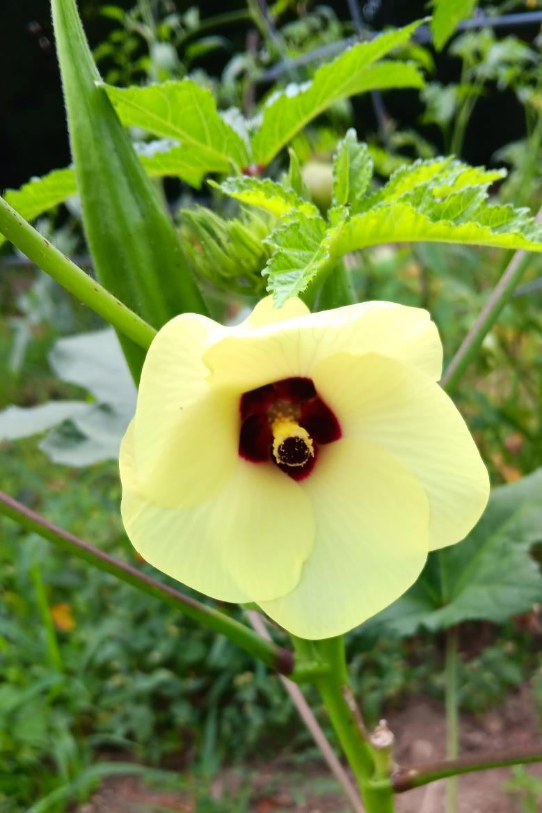 Это окра (за цветком слева длинный заострённый плод). Оказалось, что родственник гибискуса - из мальвовых. Съедобно, правда, на любителя. Хотя растёт и плодоносит хорошо - грех жаловаться, но есть свои заморочки: если дать вырасти длиннее 10 см, то становится деревянистой и несъедобной, а если снять вовремя, но готовить на малом огне, то получается склизкая гадость. Пользуюсь советом: "режьте колечками не толще сантиметра, разогрейте сковородку / масло, чтоб почти дымилось, жарьте быстро.