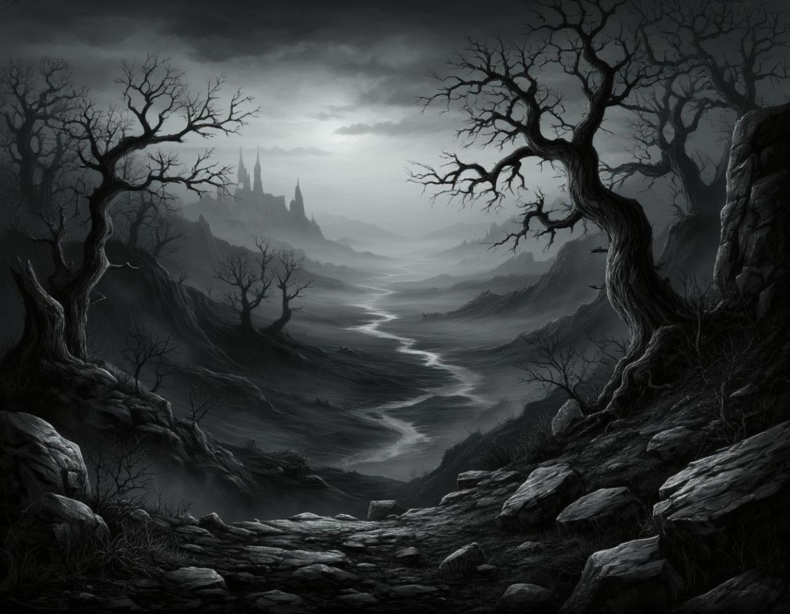 Они стояли на утёсе, и перед ними раскинулась тёмная пустошь. Грязная белёсая дымка затягивала всё мутной пеленой. Она путалась в чёрных корягах, когда-то бывших деревьями, и клубилась меж острых каменных осколков, тут и там торчавших из-под сизого пепла, под которым не видно было земли. И где-то там, в самом центре мёртвой пустоши, среди тумана и пепла, угадывалась чёрная громада колдовского замка.