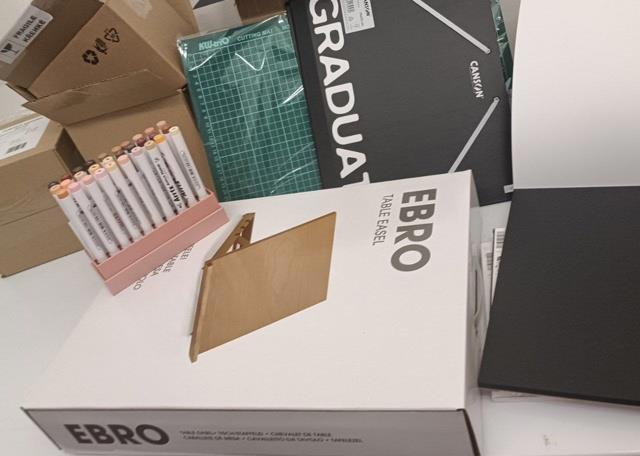 Уиииииииииииии!!! Наконец-то моя хомячиная радость ко мне доползла! настольный мольберт (надоело наползать на рисунок плоско лежащий на столе) «кожный» набор любимого Arrtx , из тех акрилок что я пробовала эта фирма самая мне нравится. Чёрную бумажку., несгибаемую папку и подложку с сеткой дабы не отмерять бисканечно поля на листочке. уруруурсеньки!!!
