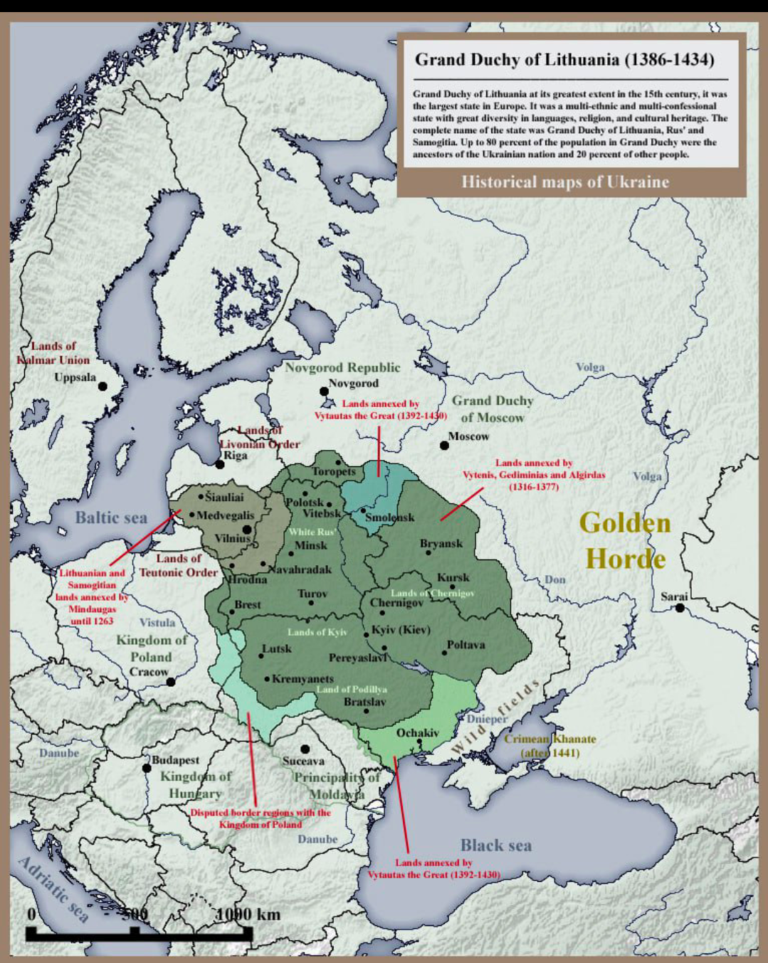 ↑ Карта Великого Княжества Литовского с указанием дат завоеваний. Вроде неточности есть на карте, но ладно. И, как порой писали средневековые переписчики книг на полях переписываемых ими фолиантов: "смотри, здесь мудрость" . В смысле, было Великое Княжество Литовское, а теперь нету. И не будет его никогда (это намёк авторам предыдущей картинки).