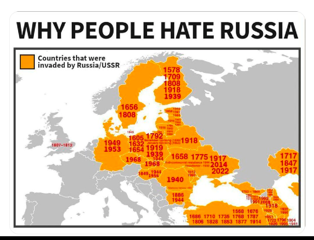 ↑ Пропагандистская поделка от тех, кто Крымский мост норовит взорвать: во, смотрите годы нападений России на разные страны. Странно, что не указан 1945 год (1944 есть). Вот вы смеётесь, а сколько среди авторов и читателей АТ людей из той страны, которые другого образования в школе и вузе не знали? Исходя из того, что образование в таком стиле там развернуто с 1989 года?