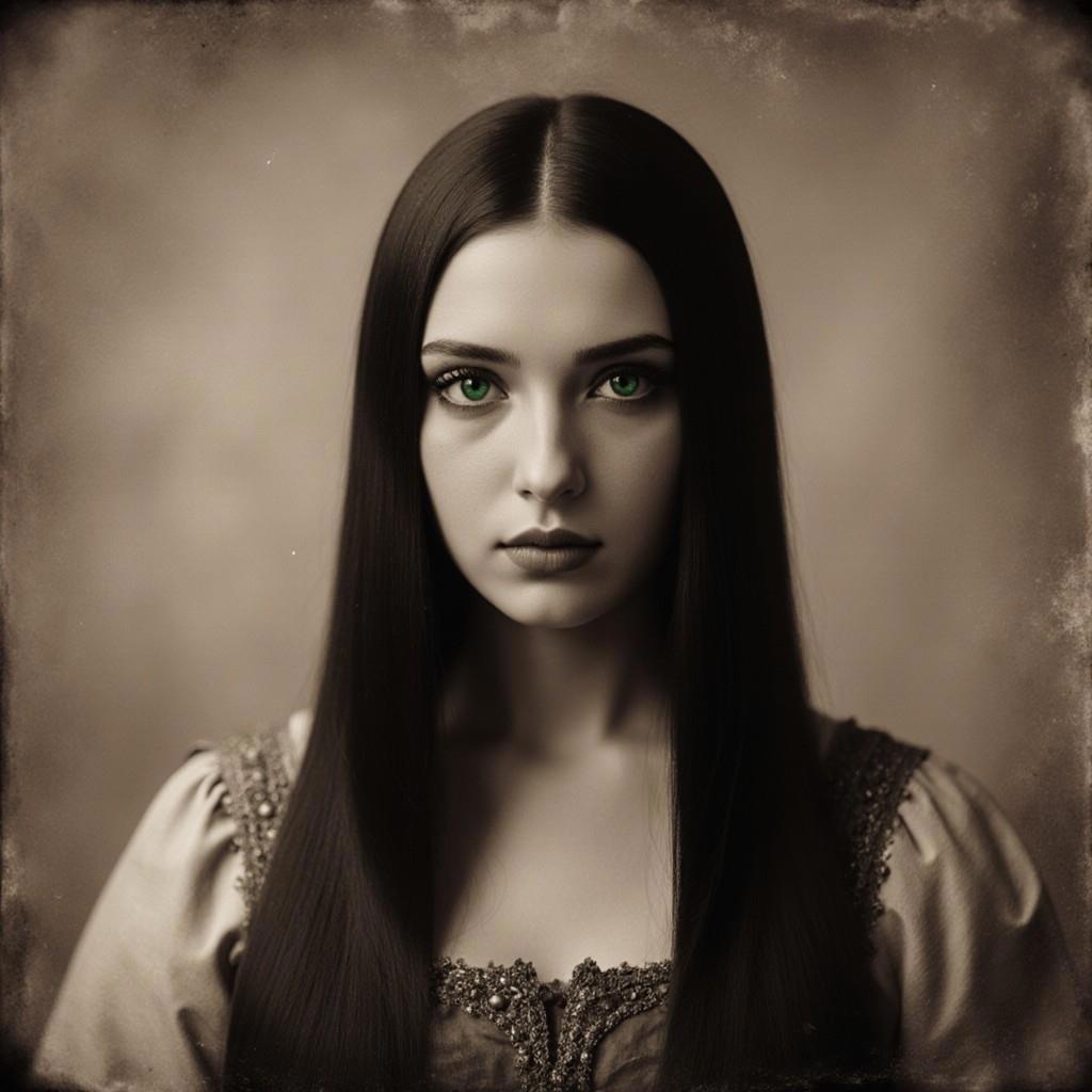 Она — девушка с вороними волосами, изумрудными глазами и непростой судьбой. В её облике есть одновременно хрупкость и сила: смуглая кожа, выразительный взгляд, чуть приподнятый острый носик и мягкие, припухлые губы. В её одежде — что-то между средневековой простотой и вневременной тайной.