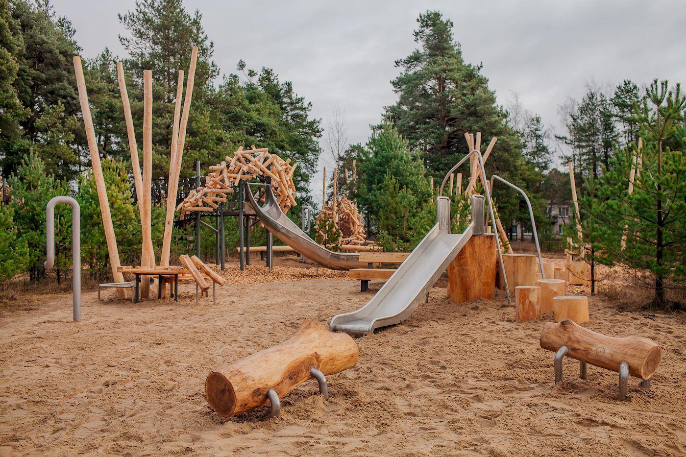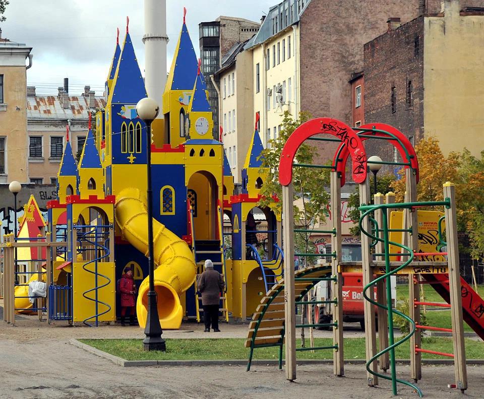 Сейчас массово заменяют на "эко-стайл" - натуральное дерево, железная прямая горка, верёвки, какие-то невнятные лазалки и прочее неприметное. Функционала в разы меньше, безопасность... ну, горки ниже, зато ноголомных скользких брёвен полно.