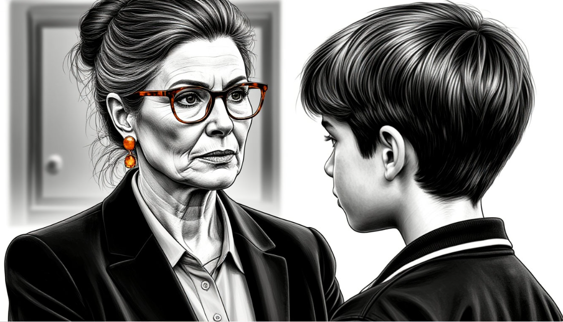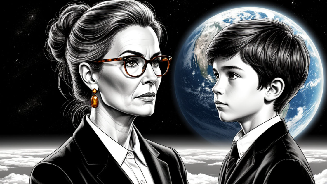 Учительница, чёрно белый, рисунок, в серых тонах, женщина, строгий вид, 44 летняя, очки "лисички", очки коричневые,янтарные серьги, тёмные волосы средней длины завязанные в пучок на затылке, чёрный пиджак. Перед ней ученик-мальчик, мальчик смотрит на неё. Задний план: изображение планеты Земля. Земля: голубые океаны, зеленые континенты, облака, вид с Луны,16k, высокое разрешение, высокая детализация, мягкое освещение