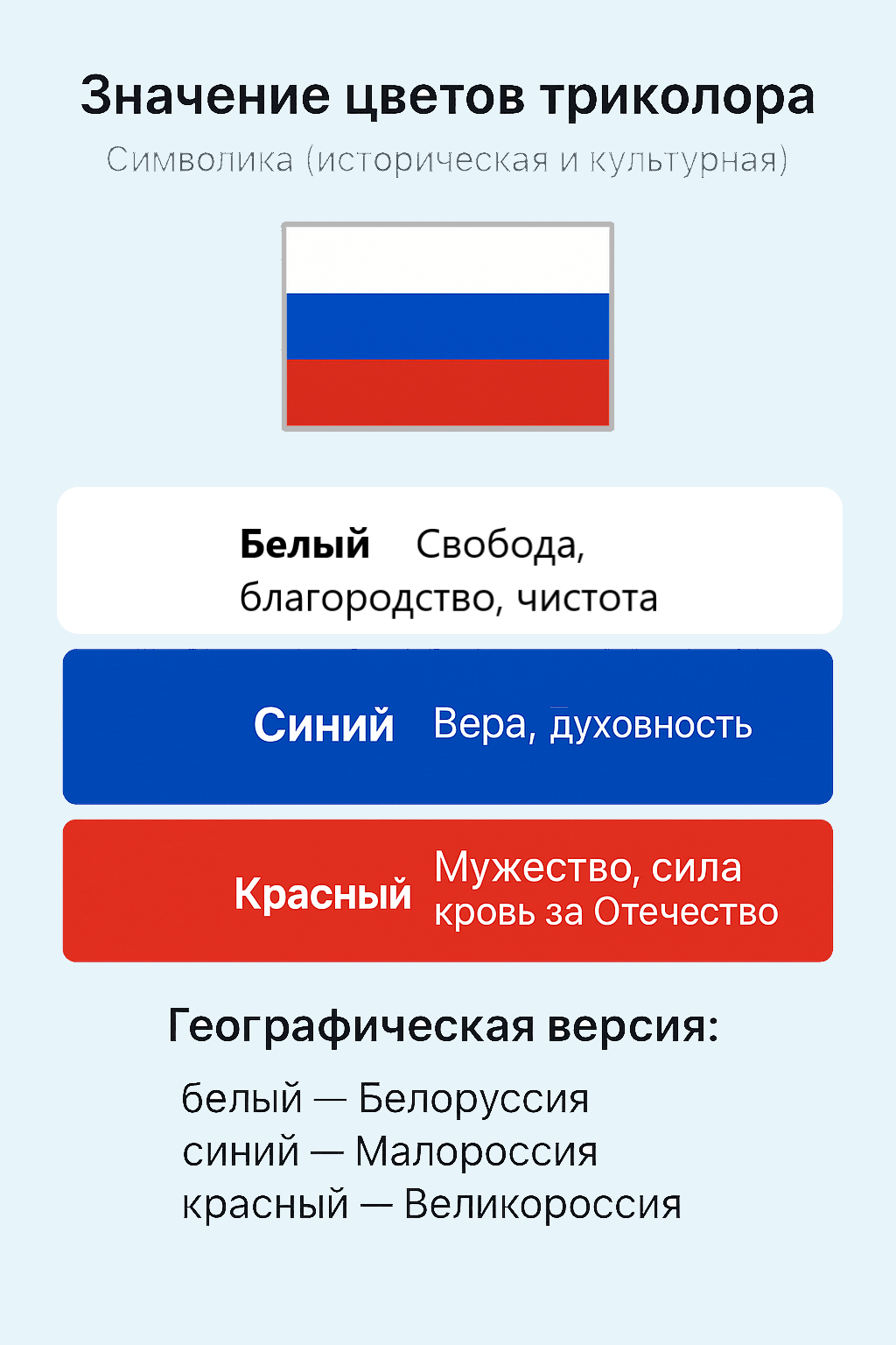 Некоторые исследователи указывают, что обозначают цвета флага России с точки зрения географии: белый — Белоруссия, синий — Малороссия, красный — Великороссия (Центральная Россия) .