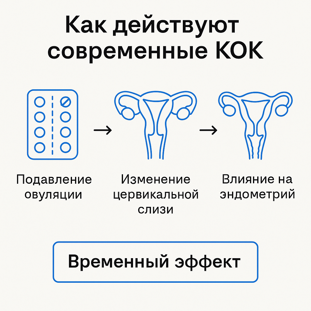 Современные комбинированные оральные контрацептивы работают мягко и обратимо. Их задача — временно регулировать гормональный фон и создавать условия, при которых зачатие невозможно.