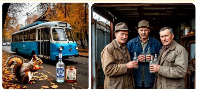 Семен Семеныч пришел в себя от того, что понял, что он всю жизнь мечтал быть троллейбусом и посему подпрыгивал, пытаясь ухватиться руками за провода. Настоящий троллейбус стоял на дороге и устами своей водительницы выражал возмущение, но это было еще не все... Мимо по тротуару прошли на задних лапах две белки в человеческий рост, причем они переговаривались между собой веселым матом. От ужаса от наступившей явной "Белочки" Почемучка протрезвел и бросился бежать домой.