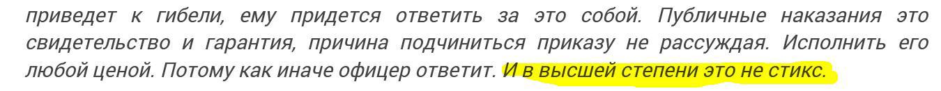 Что касается ГГ, Кая сразу приняла условия игры и получила "офицерский стикс", то есть, ошейник. Но покамест вреда от него больше, чем пользы, потому что когда кто-то из группы что-то нарушает или просто нерасторопно выполняет приказ - пытают за это Каю, пропуская по ошейнику ток или что-то типа тока. Группа абсолютно неслаженная, все недавно друг друга узнали, но все так проникаются страданиями Каи, что начинают слушаться, лишь бы ее не пытали. Кая пытку воспринимает как должное и, заметив неправильность в маскировке подсаженного в группу сексота-ксеноса, любезно подсказывает ему, что надо исправить.