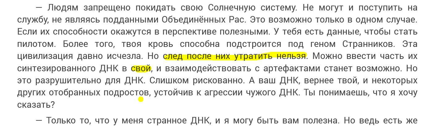 Кто-то сравнивал эту повесть с "Игрой Эндера". Но в "Игре Эндера" дети участвовали в столкновении своей цивилизации с цивилизацией инопланетной на стороне своих. А тут мы, по сути, наблюдаем за воспитанием янычар. Они находятся на военном корабле, но никто не задается вопросом - а с кем воюем, ксеносы? Не Земля ли в прицеле? Может, все предыдущие контакты - просто грамотная разведка?