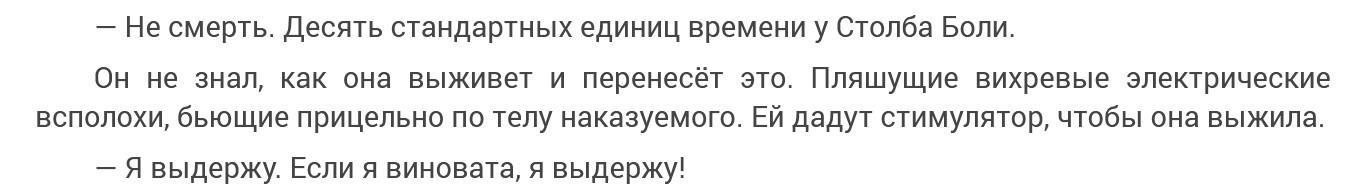 Кая даже не задумывается о том, на что способна цивилизация, у которой в порядке вещей пытать ребенка за чужие ошибки. Послушный маленький солдатик. В конце девятой главы оказывается, что пытки стиксом мало, ее приговаривают к какой-то супер-пытке у Столба Боли. Ее реакция: