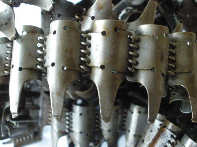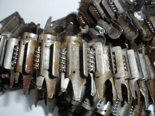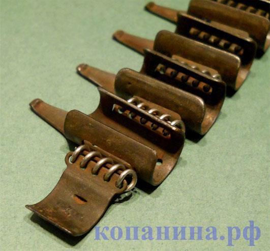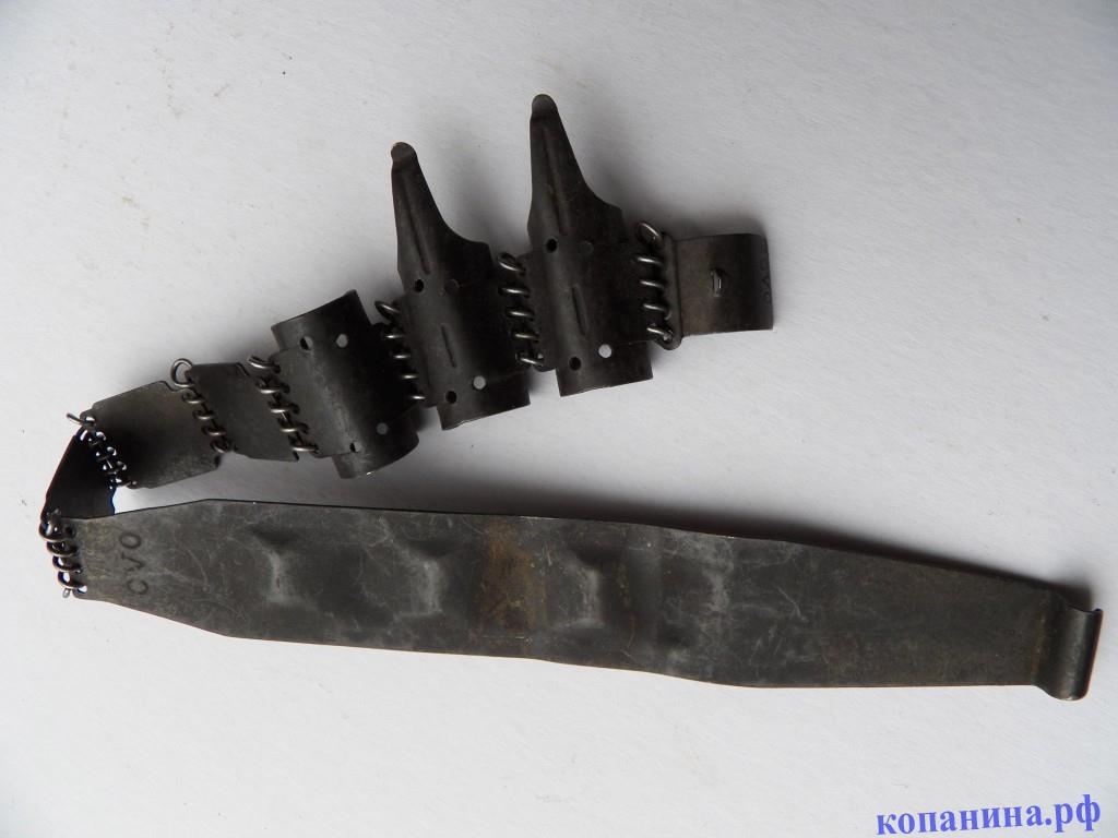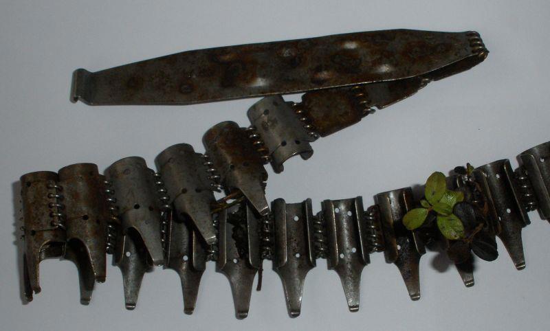 Край ленты с язычком. На всех лентах соединяющая звенья проволока делалась из нержавейки. В 1944 году спиралевидная проволока была заменена на стальные стержни