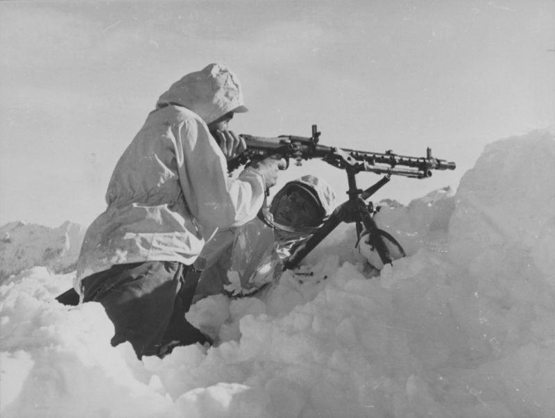 Стрельба из немецкого пулемета МГ-34. И да, к слову - при подаче голой ленты требовалась помощь второго номера, иначе был возможен перекос ленты и задержка в стрельбе.