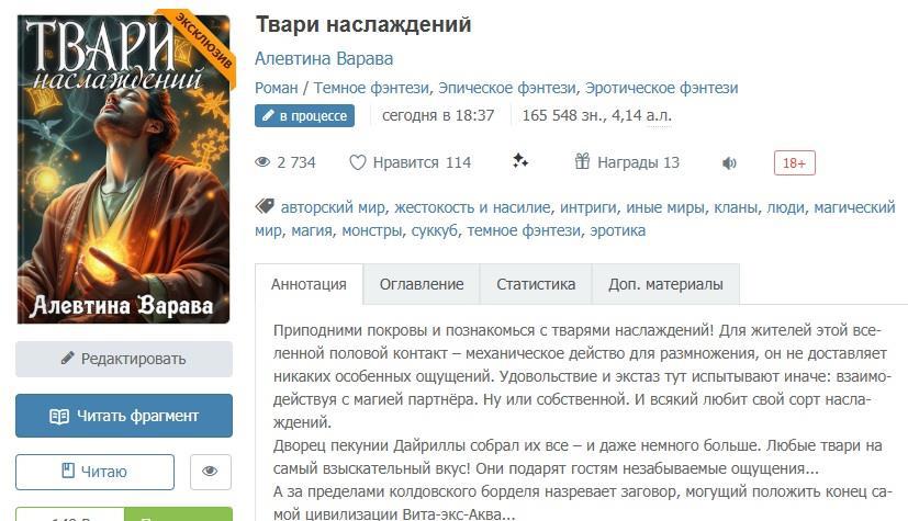 Автор: Алевтина ВараваПро особую колдовскую эротику в мире без секса. Про сложный и запутанный магический мир, в котором общество давит существ, не желающих расставаться с природой. Про монополию нереидов на воду и коварный заговор в верхних слоях власти. Про надменного богатенького мерзавца, который привык получать то, то хочет. Про хитроумную водяницу, которая мечтает заиметь личный замок. И много про что ещё...
