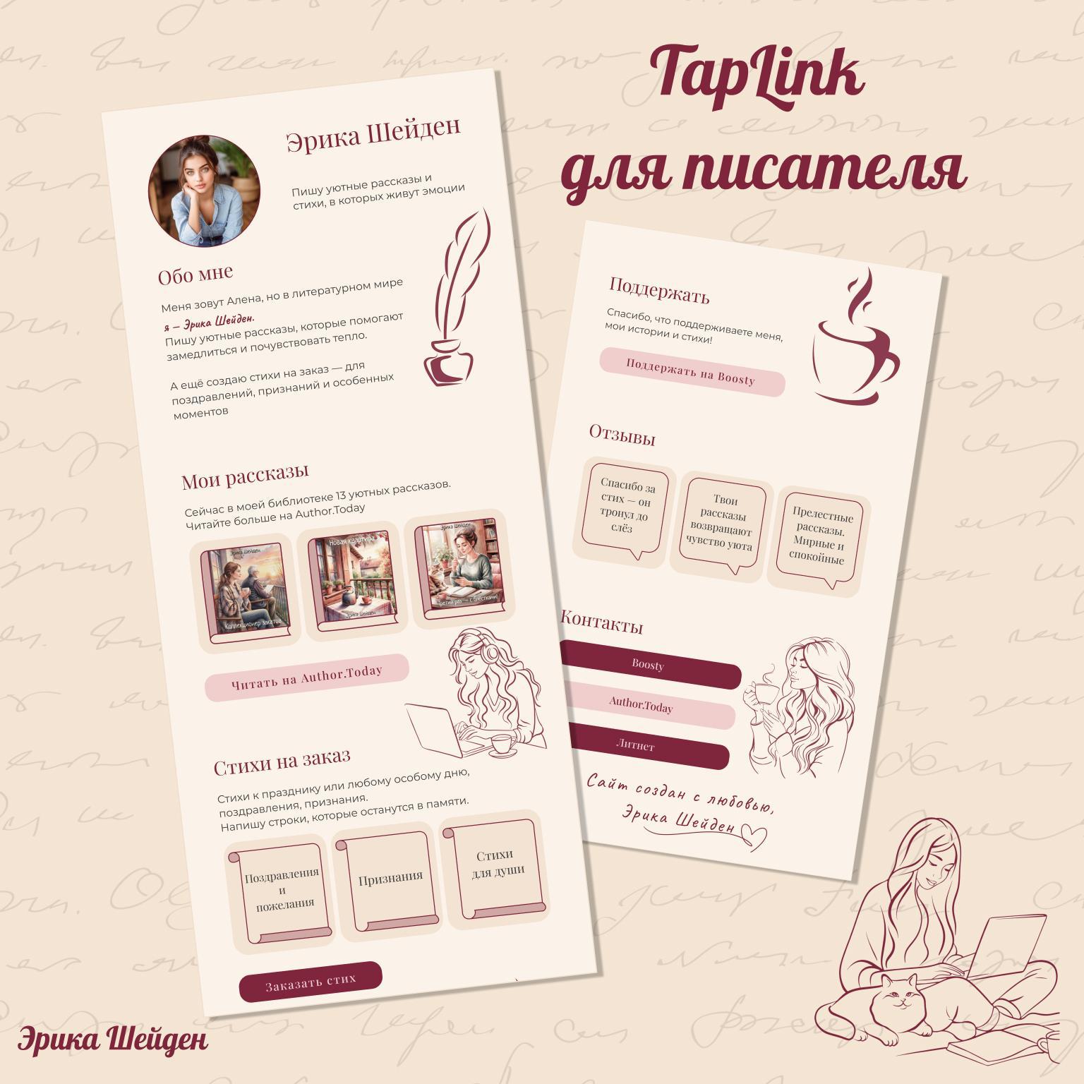 Параллельно работа кипит: заказы на ретушь, заказы на дизайны, новые проекты. И вот, делая Taplink для репетитора английского языка, я вдруг подумала: а ведь писателю тоже можно сделать такой мини-сайт. Визиточка, как приглашение в его мир. Казалось бы, не вещь первой необходимости, но приятно же — иметь свое личное пространство.
