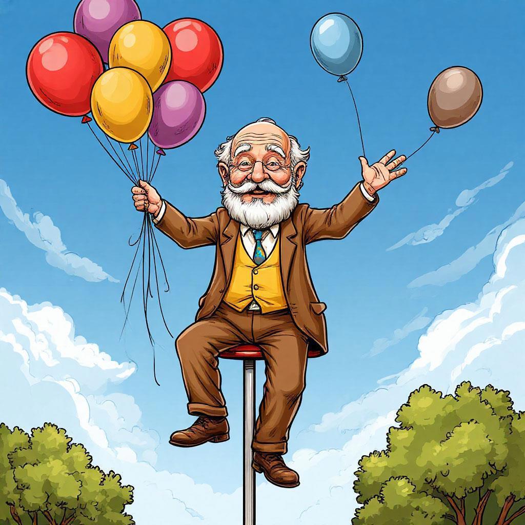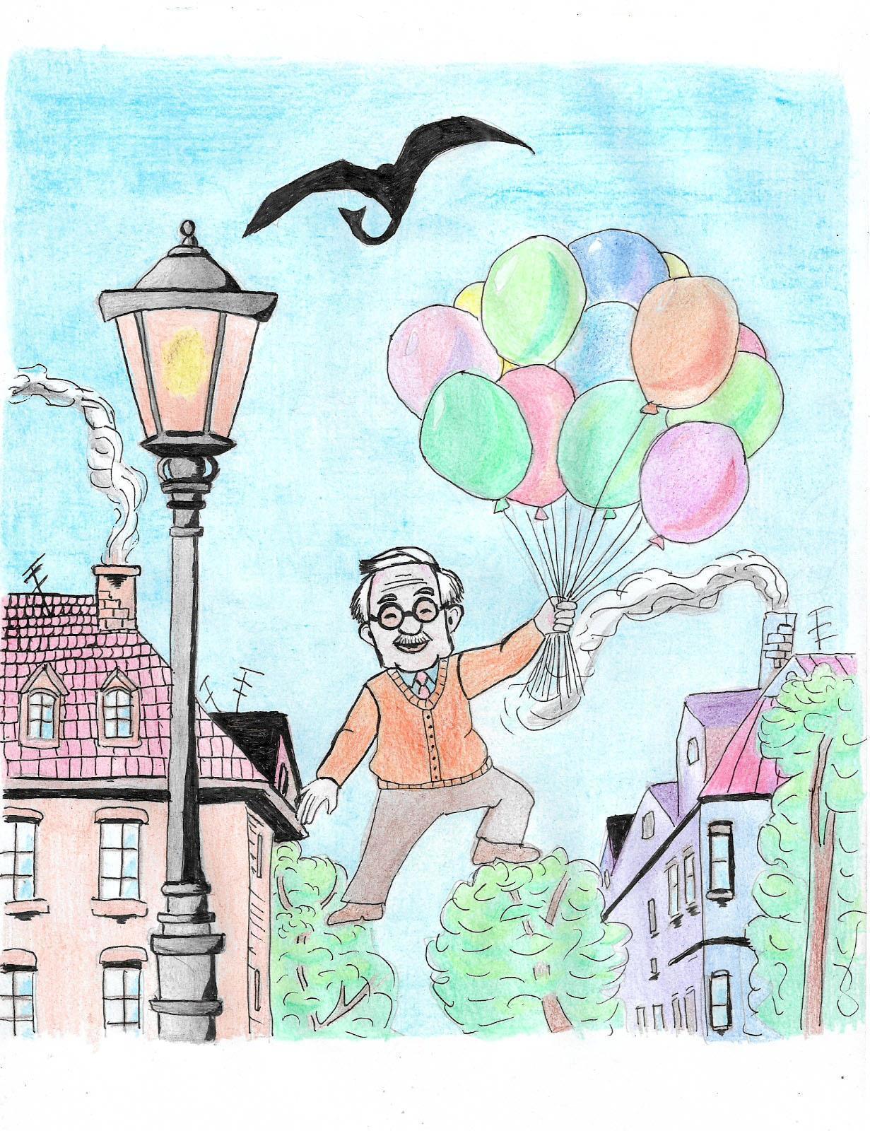 Наконец мы тормозим. На фонарном столбе действительно сидит старичок. Одной рукой держится, во второй сжимает пучок веревок, прикрепленных к кучке ярких воздушных шариков.