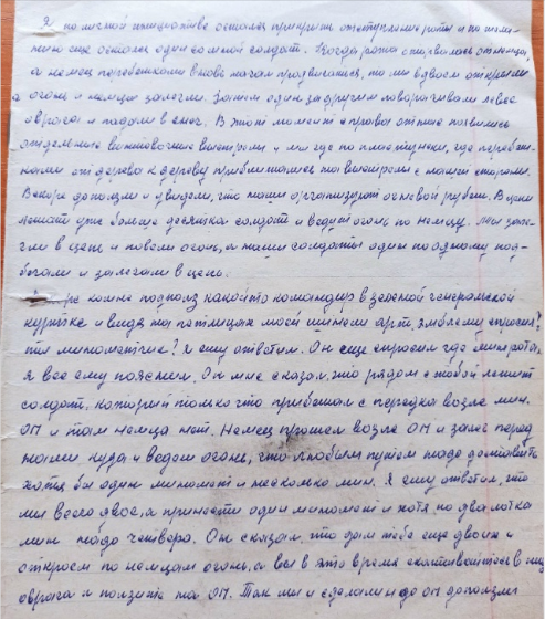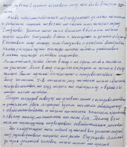 В ночь на 26-е предприняли очередную попытку пробиться к окружённому полку, доставить боеприпасы и продовольствие. Операцию проводили на нашем участке обороны, так что мы стали невольными свидетелями, а ответственным сделали нашего ротного. В сани-дровни запрягли пару лошадей цугом, загрузили продуктами, и старшина с двумя автоматчиками отправился прокладывать новый маршрут опять же между Атепцево и Елагино. Удачно галопом проскочив через дорогу, а потом перелеском ещё метров двести, они выехали в чистое поле. До спасительного леса оставалось ещё метров двести, но на этом удача и кончилась. Одна из лошадей заржала, в небо взвились осветительные ракеты, ударили пулемёты, и через четверть часа наступила тревожная тишина. Лишь только ракеты взлетали на месте короткого боя. Посылаем Макара с Гусём выяснить, в чём дело, и ждём результатов проверки. Разведчики вернулись через час и доложили, что старшина не проскочил. О чём и рассказал нам пермяк.