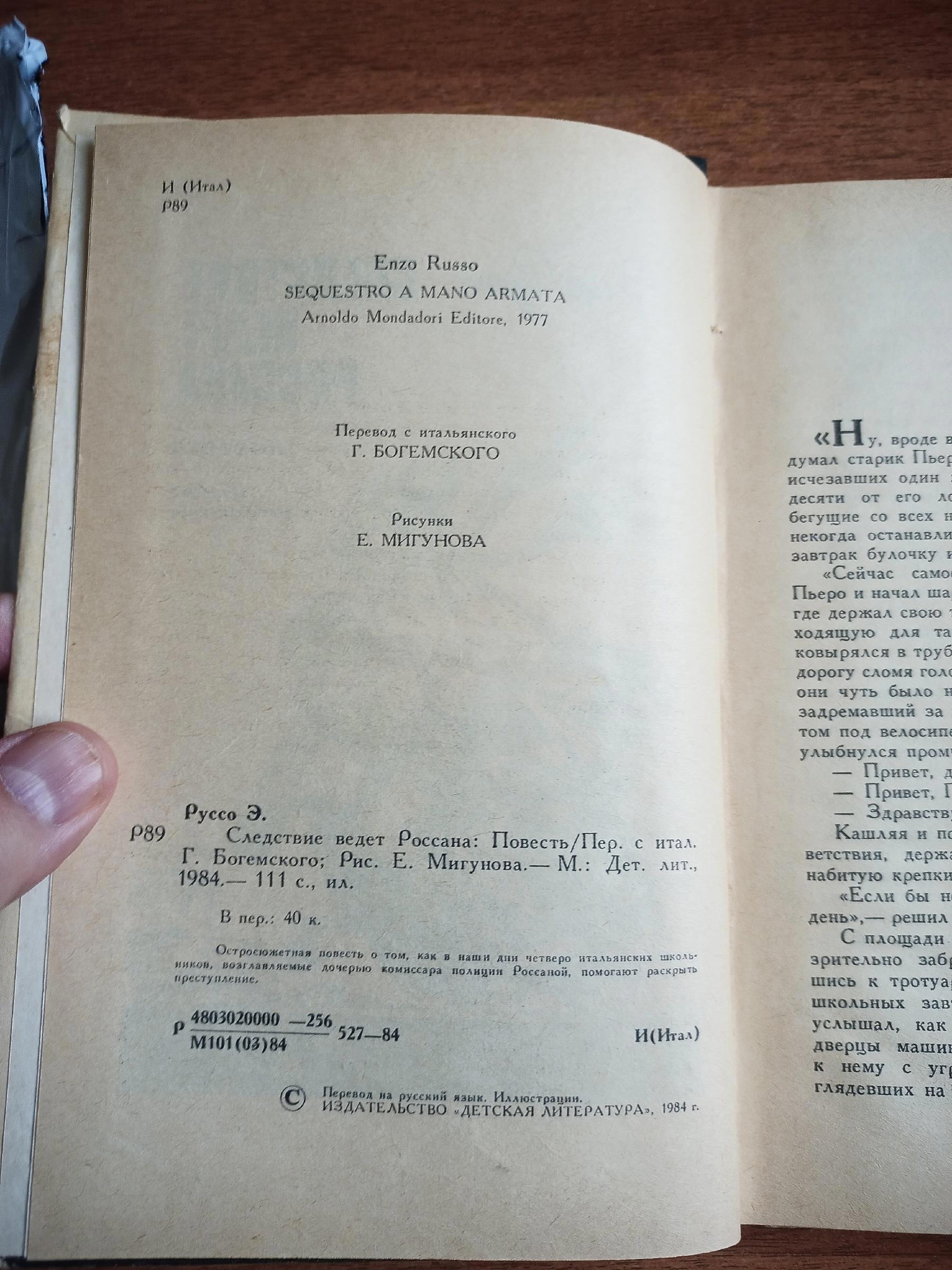 Год назад я как обычно по привычке (скорее даже на автомате) просматривал одну из подборок детской переводной литературы СССР. Подборка, кстати, составлена таким же читателем как мы с вами. И вдруг я натыкаюсь на изображение книги что вы видите над текстом статьи. Я сразу узнал ту самую недочитанную. Как же я был рад. Конечно бросился сразу в книжные сетевые магазины, набрал название книги «Следствие ведёт Россана», автора Эцио Руссо, но к моему огорчению книга с 1984 года не переиздавалась. И вообще тираж был только один - на 100 тысяч экземпляров. Согласитесь на весь огромный СССР совсем немного. Как человек в книжечках разбирающийся, я понял, что даже с рук, через букинистику эту книгу купить будет сложно. Маленький тираж, очень маленький. Да и стоит учитывать, что прошёл сорок один год.