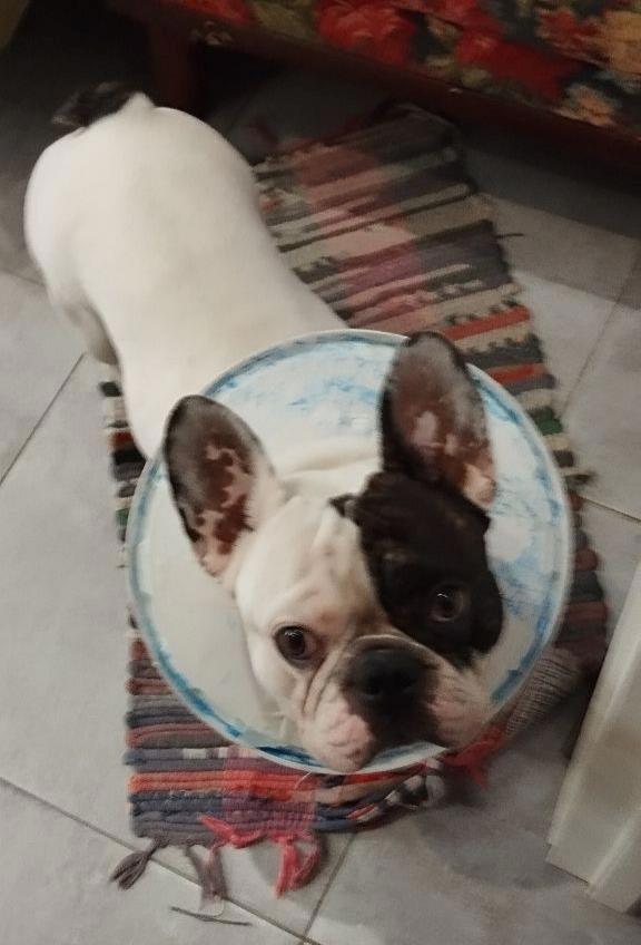 Автор: moriakoffПосле поездки на море у моего французского бульдога Мики развился невроз навязчивых состояний...Видимо это было связано с поездкой в машине,первой встречей с морем,большим количеством людей и собак на пляже... Стресс...стресс и ещё раз стресс...Приехали домой...начал чесаться и разлизывать лапы... бесконечно....до ран....И купали и давали седативные... всё впустую...Надо сказать,что такое состояние было у и моего алабая Сармата...тоже что только не придумывал....Воротник невозможно было подобрать,потому что голова была как у лошади,а таких воротников не продают...Так я ему пластмассовый тазик на шею надел,этим смог хоть как-то защитить лапы от разлизывания.... вылечить раны...По аналогии ,бульдогу приспособил пластиковую крышку от ведра из под краски...Вроде помогает...Хочу сказать,что с этими породистыми собаками всегда мучение....напрягают своими болячками....То ничего не едят,то аллергия,то невроз...А дворняжки не болеют и едят хорошо...