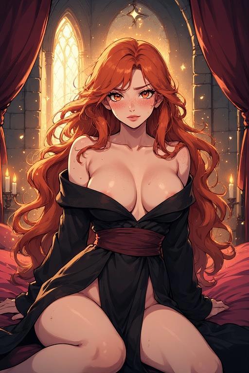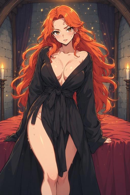 Представьте: пламя. Не то, что слегка потрескивает в камине, а настоящее, дикое и неуёмное. Таким же огнём горят её длинные рыжие волосы, рассыпающиеся по плечам, как расплавленная медь. Лицо усыпано россыпью веснушек, будто кто-то щедрой рукой рассыпал золотую пыль по её коже. А глаза... светло-карие, тёплые, как старый коньяк.