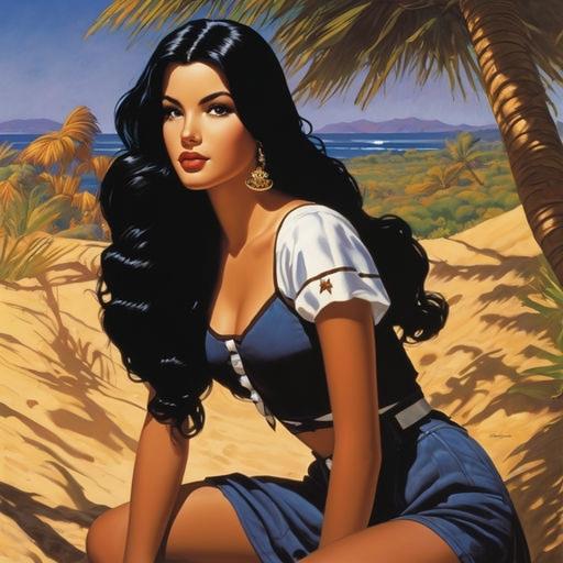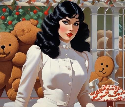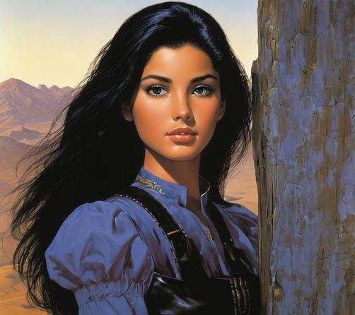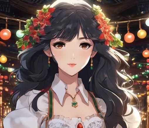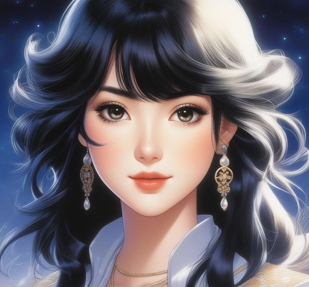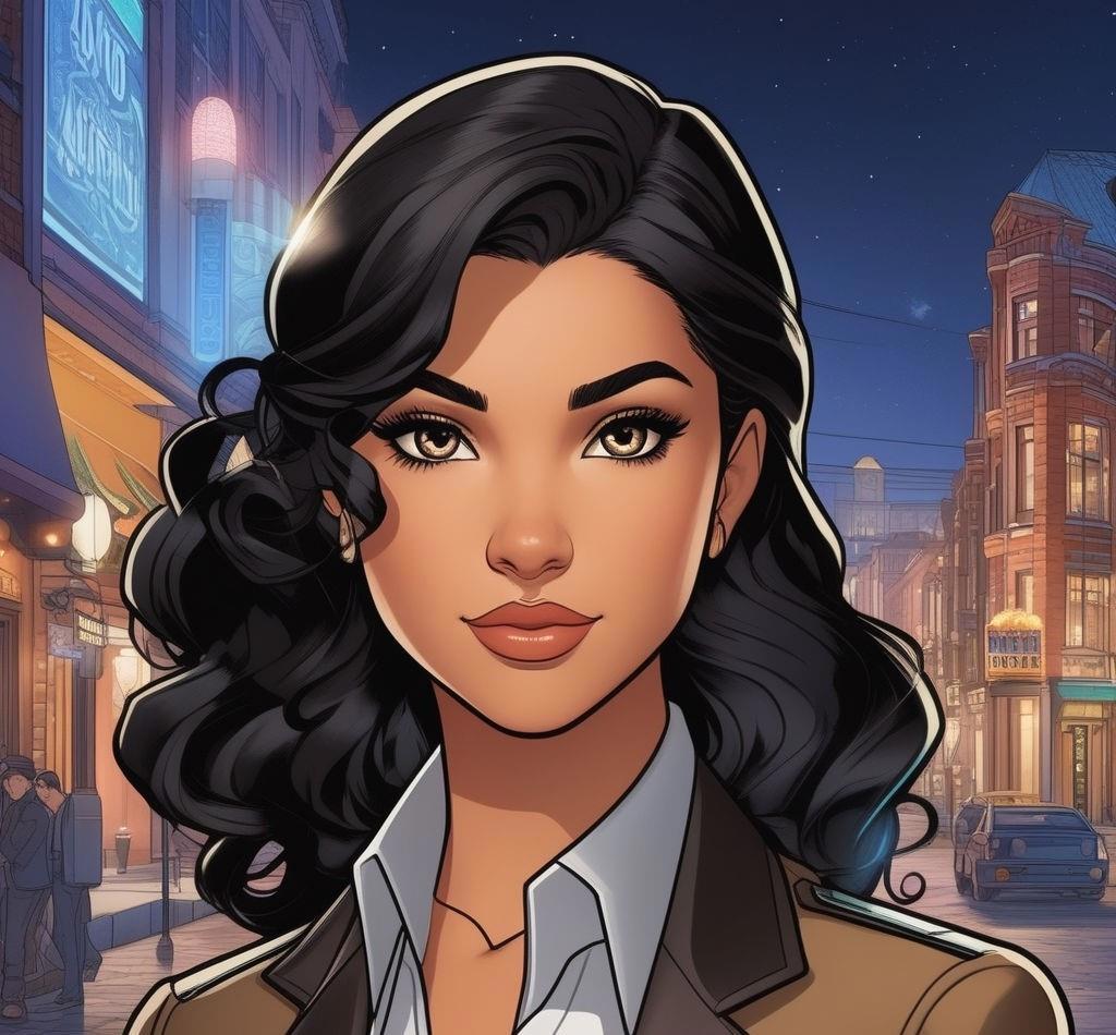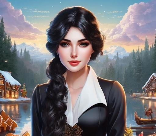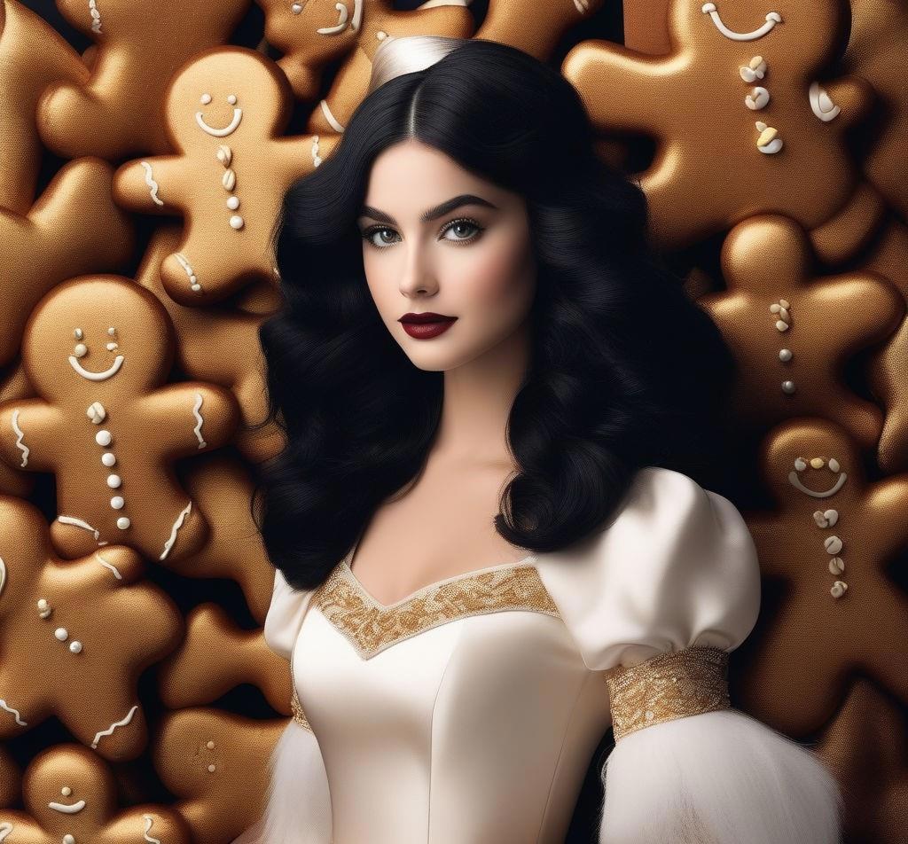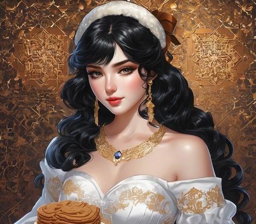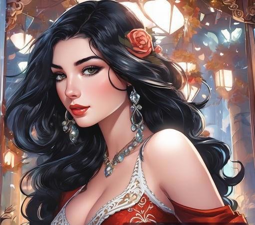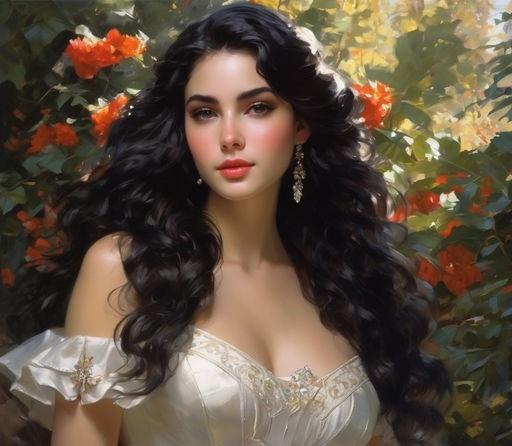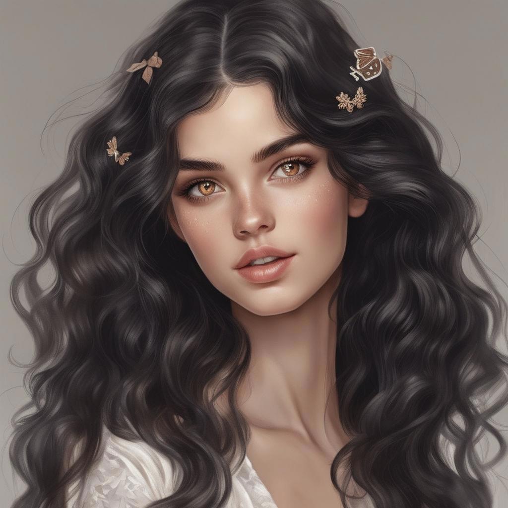 Двадцатидвухлетняя молодая девушка с белой мерцающей кожей и волнистыми мерцающими черными волосами и мерцающими глазами цвета пряника