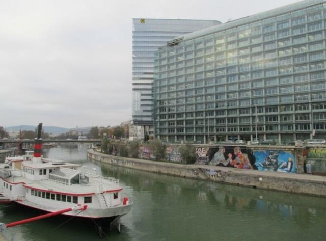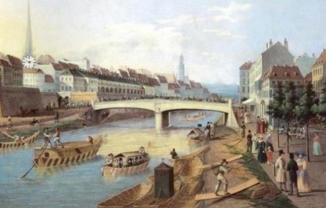 Вот еще картинка, она 1828 года. Искомый дом "Дианабад" - справа, немного заслонен деревьями. Почти перед ним, над рукавом Дуная, Мост Фердинанда (он сейчас существует, но вид имеет уже новый). А на левом берегу, где расположена историческая часть Вены (она еще окружена мощными стенами, их видно) - большое длинное здание со сквозной галереей. Это Мюллеровская галерея ("Мюллер" - псевдоним графа Йозефа Дейма, вынужденного некоторое время зарабатывать на жизнь как скульптор и галерист). Венские варвары ее тоже снесли в начале 20 века, хотя сейчас там мог бы быть крупный музейный центр.