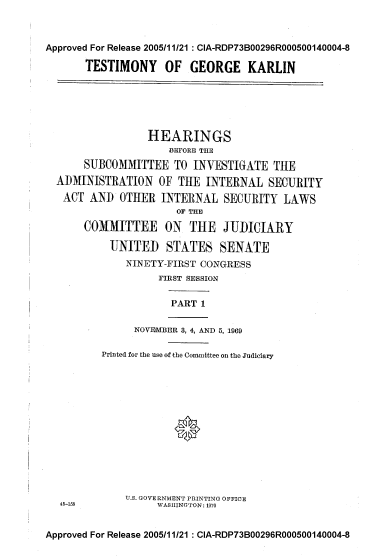 Официально документ называется "Показания Джорджа Карлина подкомитету по вопросам внутренней безопасности юридического комитета 21-го конгресса США первой сессии". Фу-у-х! Он отпечатан в 1970 году внутренней типографией правительства США и с печатного станка вышел уже с грифом "секретно" (снят ЦРУ в 2005, поэтому и читаем). Документ представляет собой три пухлые папки стенограмм опроса человека по имени Джордж Карлин. В присутствии сенатора Тормонда, который берёт с Карлина обязательство говорить правду, только правду и ничего, кроме правды, опрос, а, по сути, многочасовой допрос ведёт "адвокат" Соувайн. Адвокат поставлен в кавычки, поскольку после первых трёх страниц стенограммы ясно, что вопросы задаёт сотрудник отдела контрразведки ФБР (кто ещё на протяжении двух недель по несколько часов в день может задавать одни и те же вопросы, постоянно путая опрашиваемого с именами, фактами и датами?). Ну что ж, так даже интересней, не правда ли?