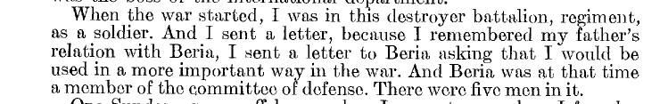Вначале ничего интересного. Агент ФБР проверяет, не спутает ли Кротков точные даты, с какого и по какой год он учился в Тбилисском университете, когда и каким образом оказался в Москве? Интересный момент. В Тбилиси Кротков учился в университете искусств по классу живописи и скульптуры, а в Москву перевёлся в Литературный институт. Как так? Кротков объясняет, что просто сел и написал письмо Деканозову (генералу НКВД, ближайшему соратнику Берии, последнему послу СССР в фашистской Германии, посланному туда Сталиным в надежде предотвратить войну). В письме Кротков написал примерно следующее: "Батоно Деканозошвилли, помнишь ли ты моего покойного отца-художника, который рисовал в Тбилиси Лаврентия? Так я его несчастный сын-сирота и не могу перевестись в Москву". Мольба была услышана, Кроткова без вопросов перевели на 2-й курс Литературного института им. Горького в Москве и дали 22 м. комнату в коммуналке на Чистых прудах. Тут же Кратков упоминает, что в 1943 году, когда он вернулся в Москву из эвакуации, его комната в коммуналке оказалась занята другим человеком (обычное явление в те годы: людей лишали жилья за отсутствие квартплаты). Тогда он сел и написал письмо другому ближайшему соратнику Берии, генералу НКВД Богдану Кобулову: "Батоно Кобулов, помнишь ли ты моего отца-художника...". Через три дня он вернулся в свою квартиру, а того мужика-новосёла Кротков больше не видел.