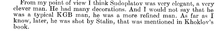 После получения этого письма ему позвонили из НКВД и попросили прийти. Там его встретил полковник 4-го (диверсионного) Управления Судоплатов (в этом месте стенограммы я задумался: вот нахрена американцам столько всего знать?). Судоплатов рассказал Кроткову, что из таких парней как он, НКВД формирует "артистические бригады" и не хочет ли он к ним присоединиться? В комнату на смотрины вошёл Эйтингон, заместитель Судоплатова, и Кротков ему сразу не приглянулся. В этой части рассказа Кротков подтверждает свидетельство Хохлова (отдельная история) о том, что НКВД еще в сентябре 1941 готовило отряды подполья на случай сдачи Москвы. Молодым парням и девушкам, обладающих артистическими данными и способными выступать на сцене, были выданы фальшивые документы, согласно которым были сфабрикованы все записи в паспортных столах, домовых книгах и ЖЭКах, а эти группы переведены на нелегальное положение еще с сентября 1941 (!!!). Короче, если бы не этот Эйтингон, забраковавший паренька, судьба Краткова могла бы сложиться иначе. Как тот же Хохлов, он тоже мог взорвать в Минске гауляйтера Белоруссии Кубэ и получить боевой орден из рук Сталина. Но от героической судьбы он тоже откосил. Обращает на себя внимание одна важная деталь. Говоря о дальнейшей судьбе Судоплатова, Кротков сообщает фэбээровцу, что он был расстрелян Сталиным. Вот его слова: