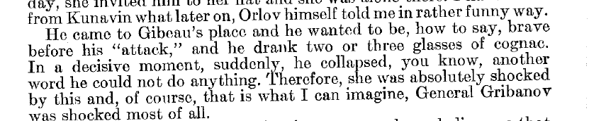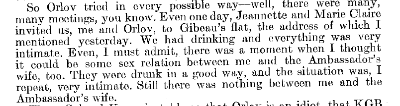 - Нет, приказ (в оригинале order) ухаживать за Жанетт Жибо, женой помощника военного атташе, Орлов получил в 1957 году, уже после фиаско с женой посла (в ялтинской гостинице Ореанда тот залез через окно в номер жены посла, на что она ответила "нет, только не сейчас", - расценено как неудача).