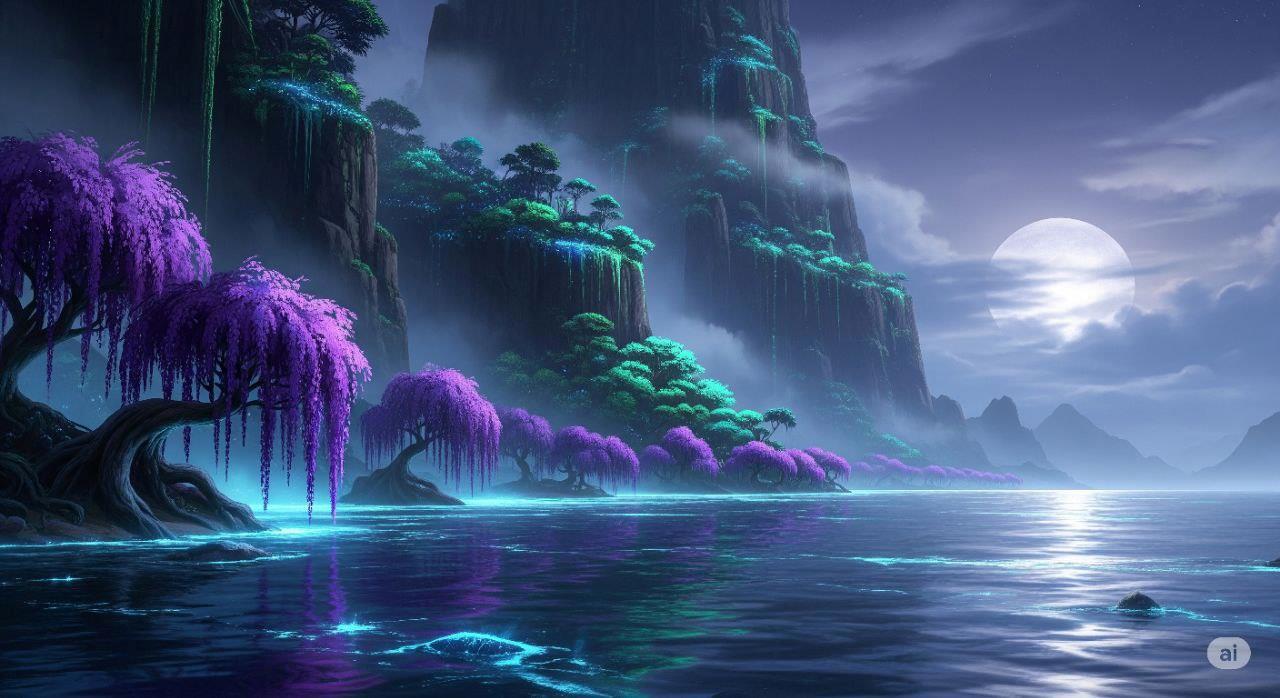 Пс-с! Если вам кажется, что эти "странные фиолетовые ивы" стоят, будто заградотряд — то вам не кажется. Хроники говорят, что во времена войны полукровок деревья на дриадских берегах цвели исключительно алым: они питались кровью захватчиков, ни один из которых так и не добрался до сердца леса.