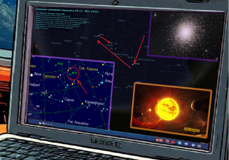 Место, куда попала "ЗАРЯ-2" в результате прыжка через "суперобруч". Шаровое скопление М13 в созвездии Геркулеса. 25 000 световых лет, не жук чихнул...
