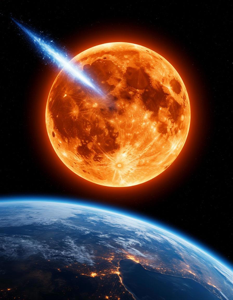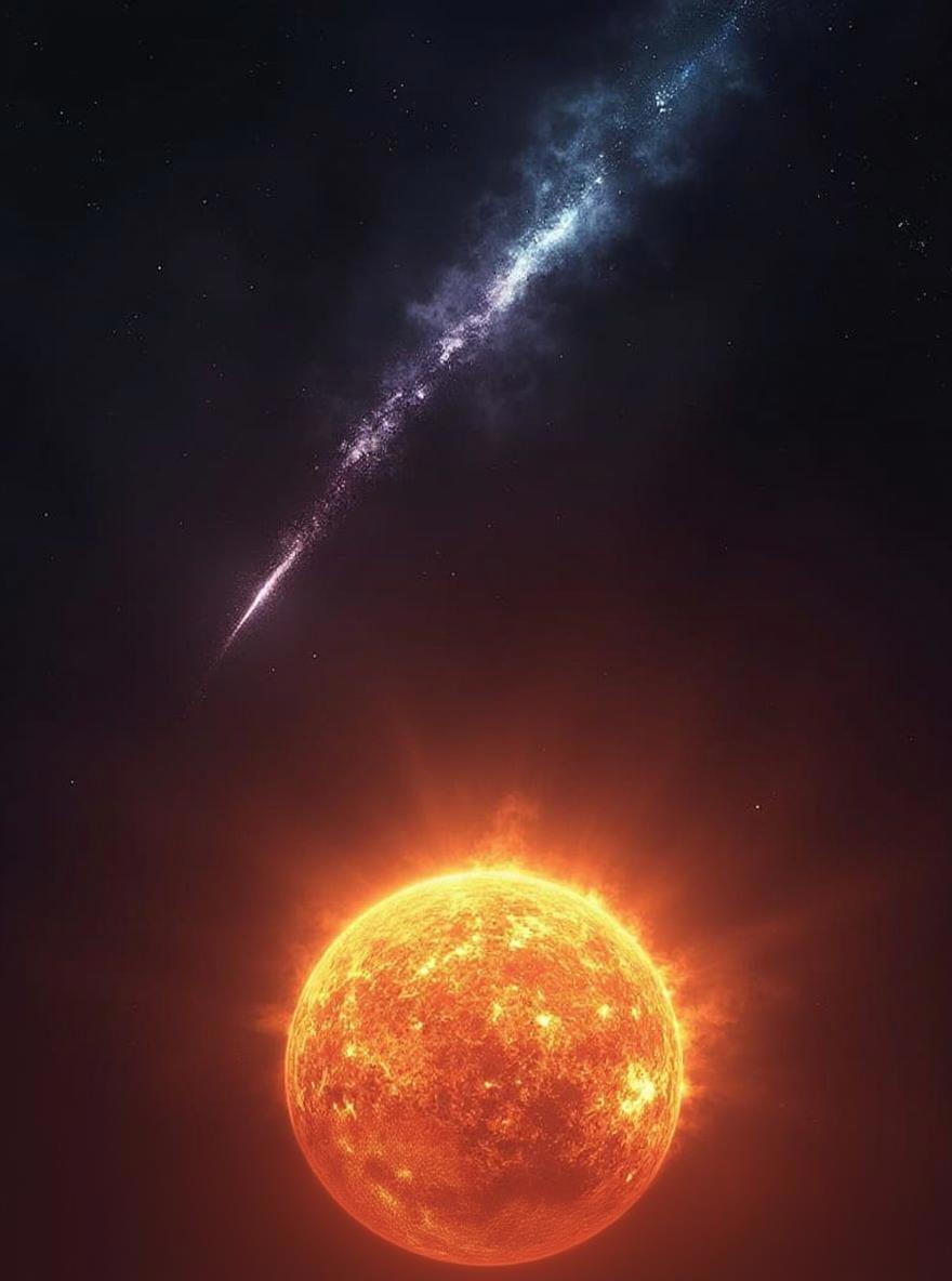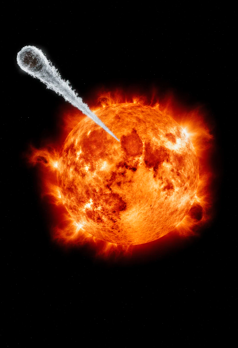 Запрос везде был одинаковый: Black empty space as observed over a partial picture of an orange sun with distinctive corona boiling in front bottom. An ice comet, blue and white with long tail approaching the sun from afar, from the top left corner, flying towards the sun