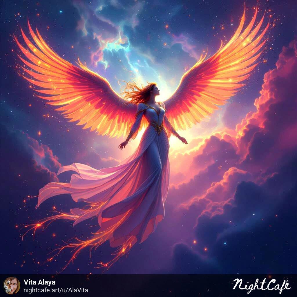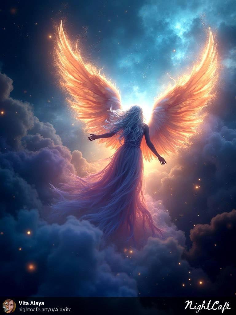 Нашла и то, на что это было похоже из моего: A colorful nebula looking like an angel with wings wide open, photorealistic, hi res, magic feeling (не помню, чего я пыталась добиться, кажется фона куда-то)
