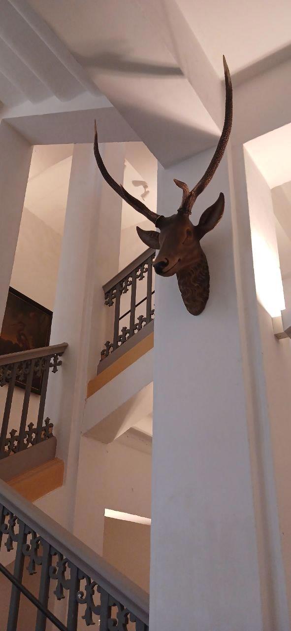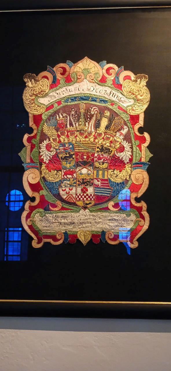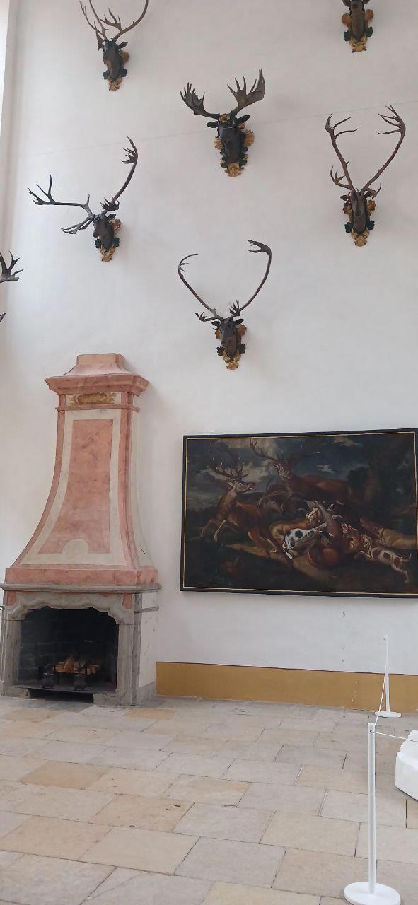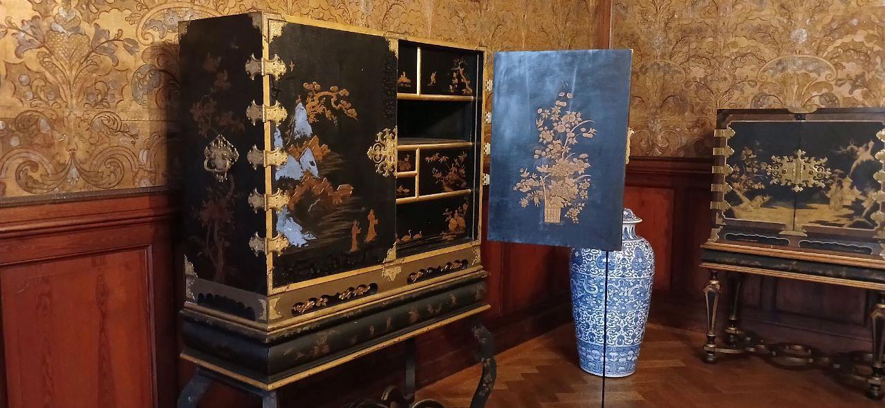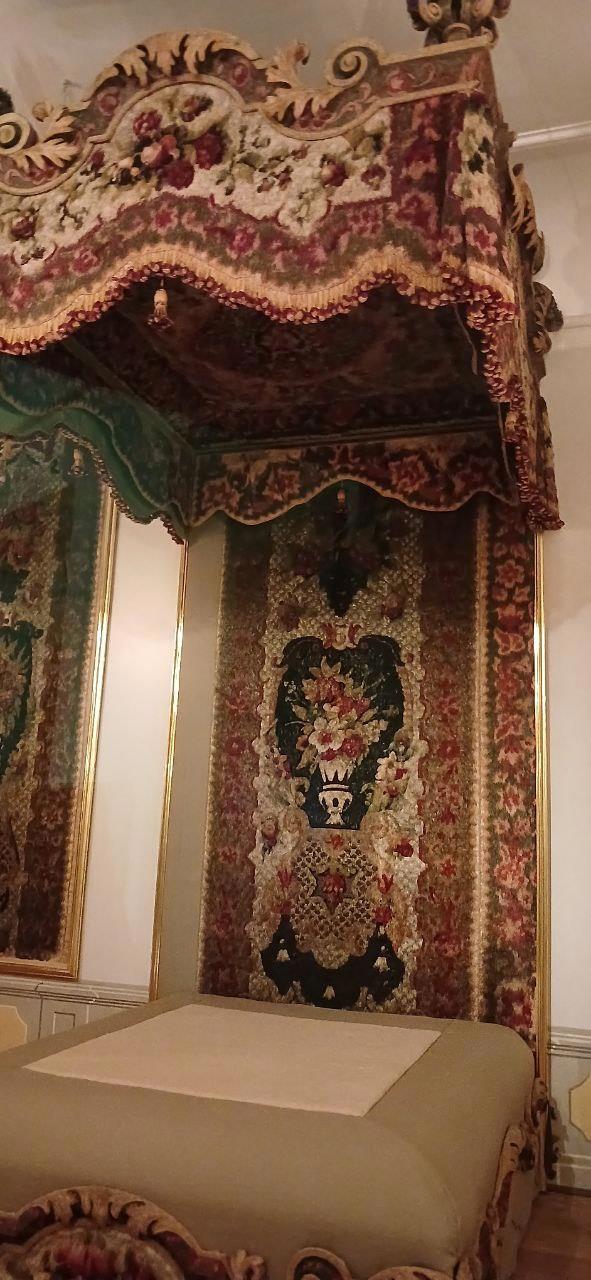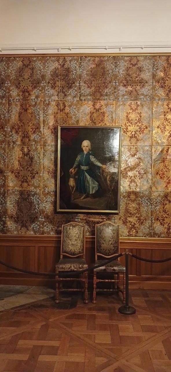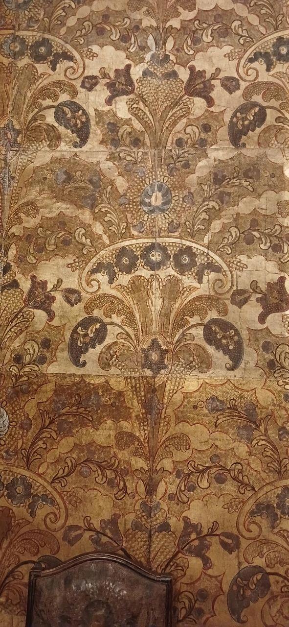 Кожаные обои. По-моему, больше нигде таких нет. В российских дворцах того же периода обычно шёлк на стенах.