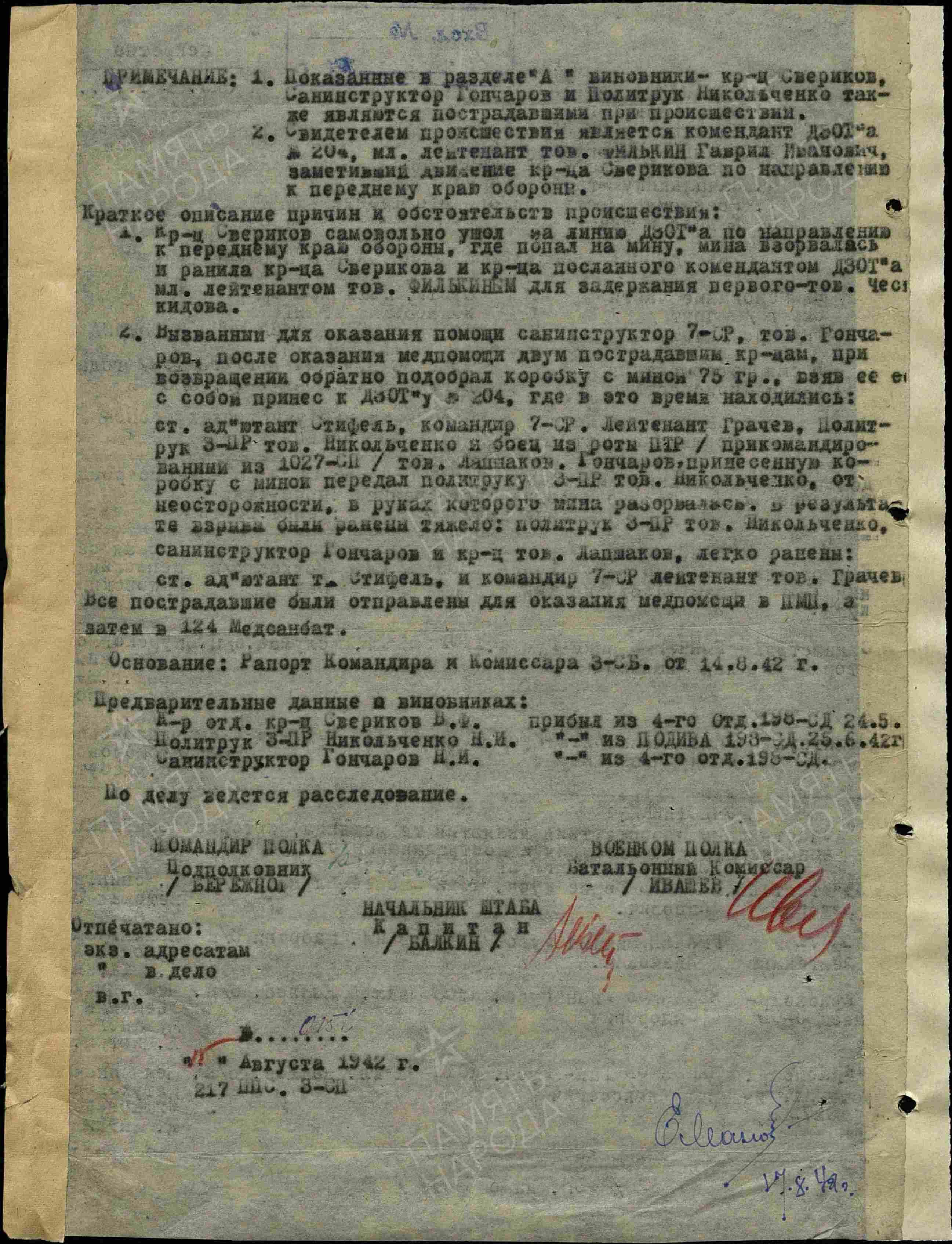 Ст. адъютант Стифель, командир 7-СР. Лейтенант Грачев, Политрук 3-ПР тов. Никольченко и боец из роты ПТР (прикомандированный из 1027-СП) тов. Лапшаков. Гончаров принесенную коробку с миной передал политруку 3-ПР тов. Никольченко, от неосторожности в руках которого мина разорвалась. В результате взрыва были ранены тяжело: политрук 3-ПР тов. Никольченко, санинструктор Гончаров и кр-ц тов. Лапшаков, легко ранены: ст. адъютант Стифель и командир 7-СР. лейтенант тов. Грачев.