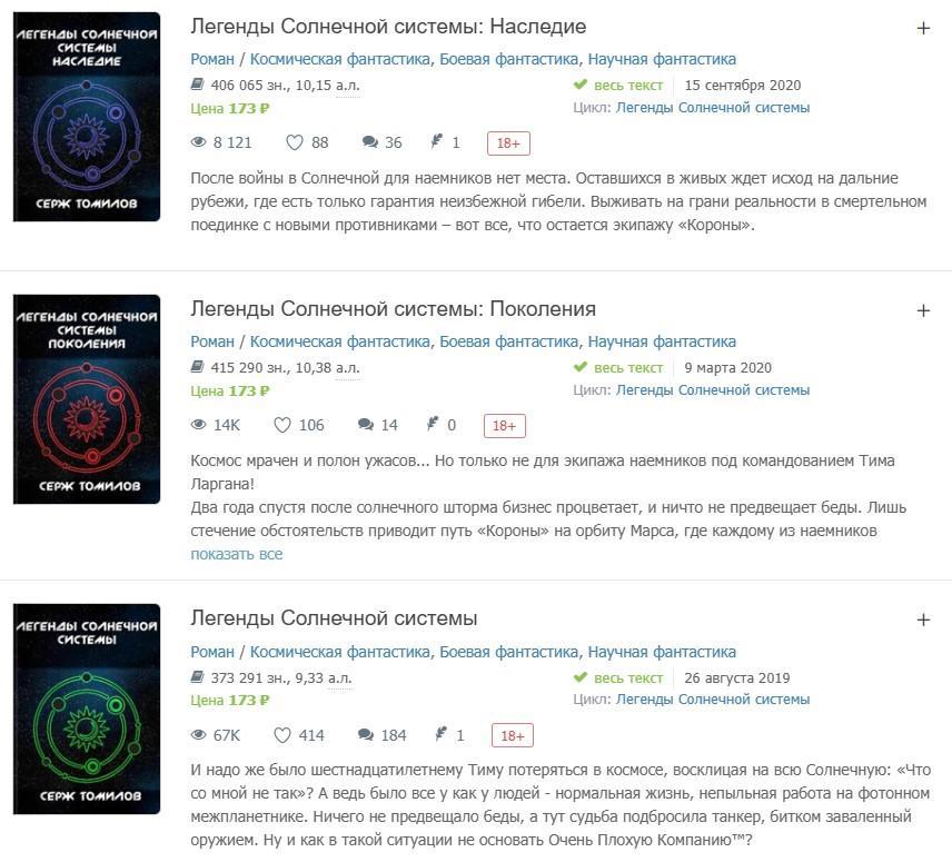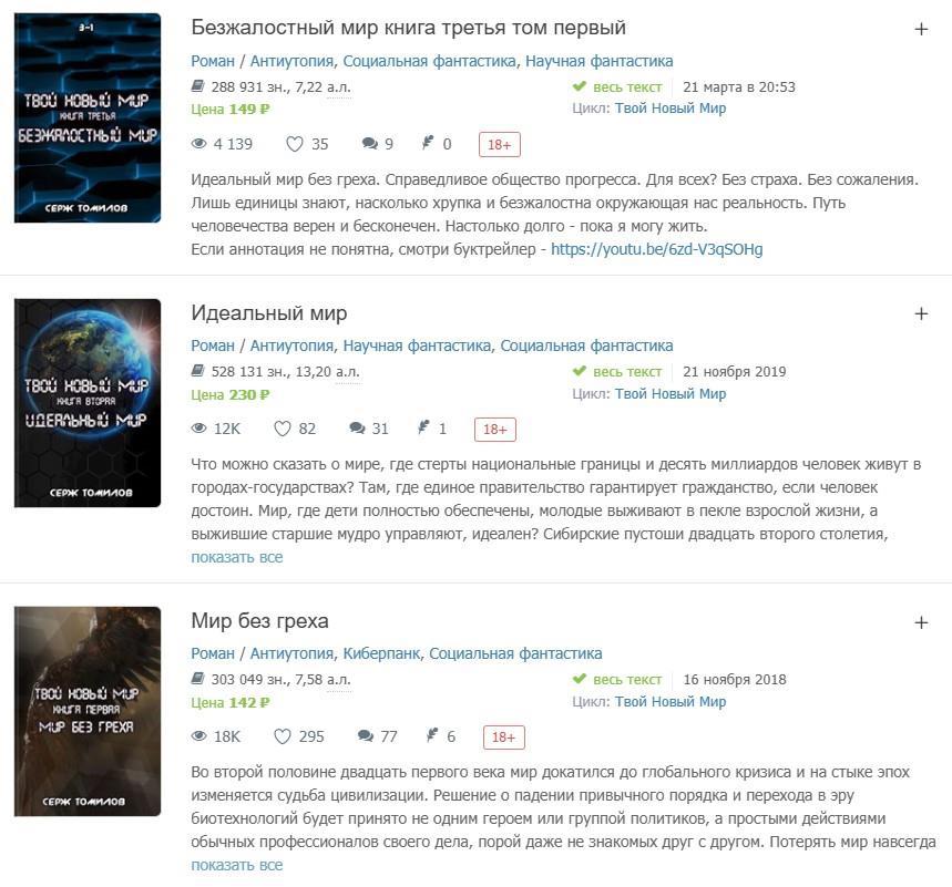 Так что по новым правилам AuthorToday, согласно вступающему в действие с 1 сентября законодательству, книжные циклы антиутопии «Твой Новый Мир» и космической фантастики «Легенды Солнечной системы» имеют возрастное ограничение