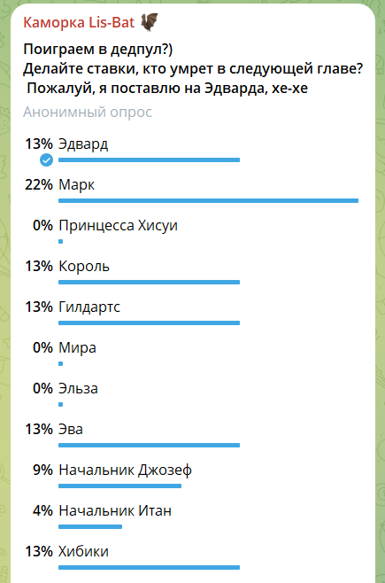Еще поделюсь с вами новостью, от которой до сих пор пробивает на хи-хи. Я писала новую главу к Миссии: Hurt/Comfort и там случилось одно событие, о котором вы узнаете в четверг, но которое вернуло меня в славные времена, когда Бубенцы были онгоингом на фикбуке. В телеграмм-канале мы часто устраивали дедпулы, где читатели пытались угадать, кто умрет в следующей главе. Эта была забавная игра. Я на протяжении нескольких глав расставляла ружья, а они их искали. Как правило, им не удавалось угадать, кого же я решила убить, но они проводили целые расследования на этот счет, хе-хе. Вчера у нас снова прошел дедпул, и я от души посмеялась, когда в нем победил главный герой - Марк.