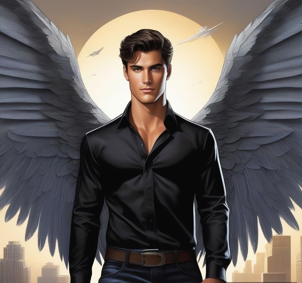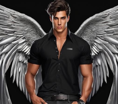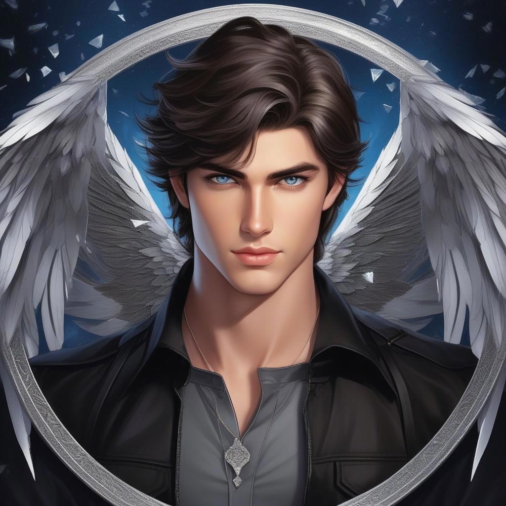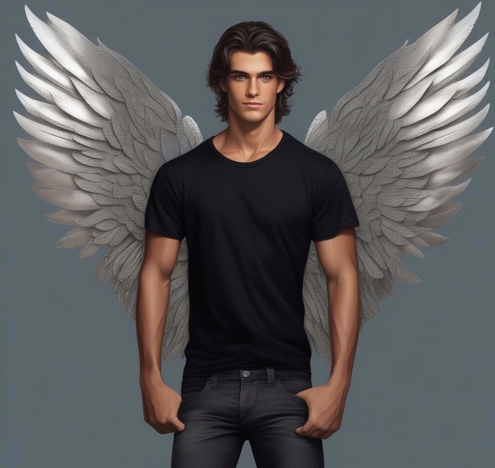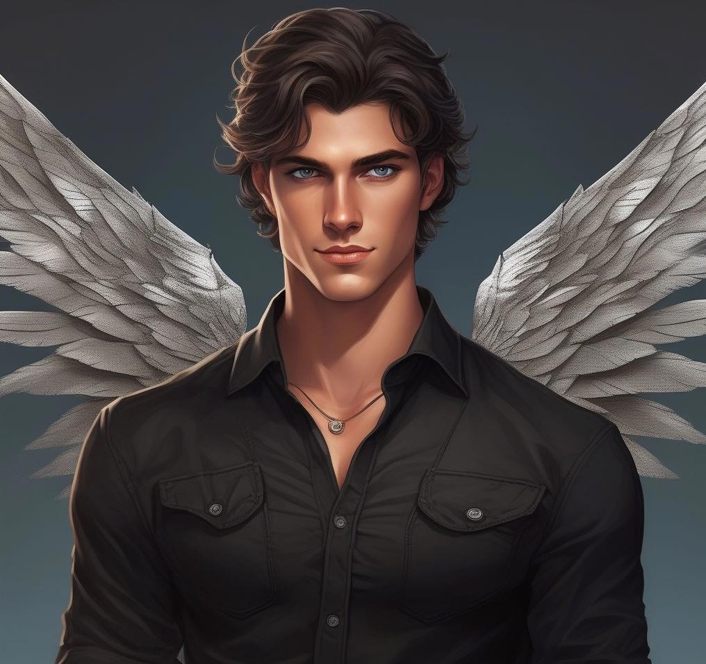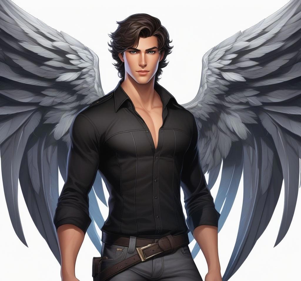 двадцатипятилетний загорелый молодой мужчина с темно-русыми волосами, которые стоят дыбом, овальным лицом, чуть курносым носом и серо-голубыми глазами, одетый в черную рубашку, черные джинсы, высокие шнурованные ботинки. За спиной огромные восемнадцатиметровые серебряные крылья