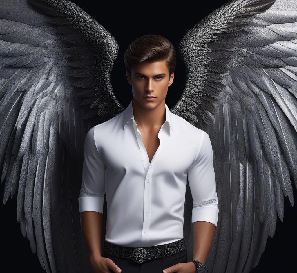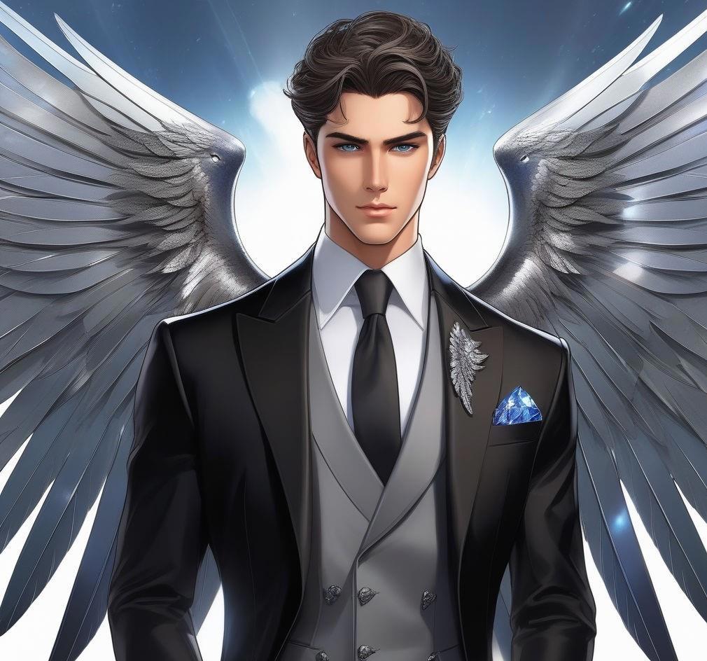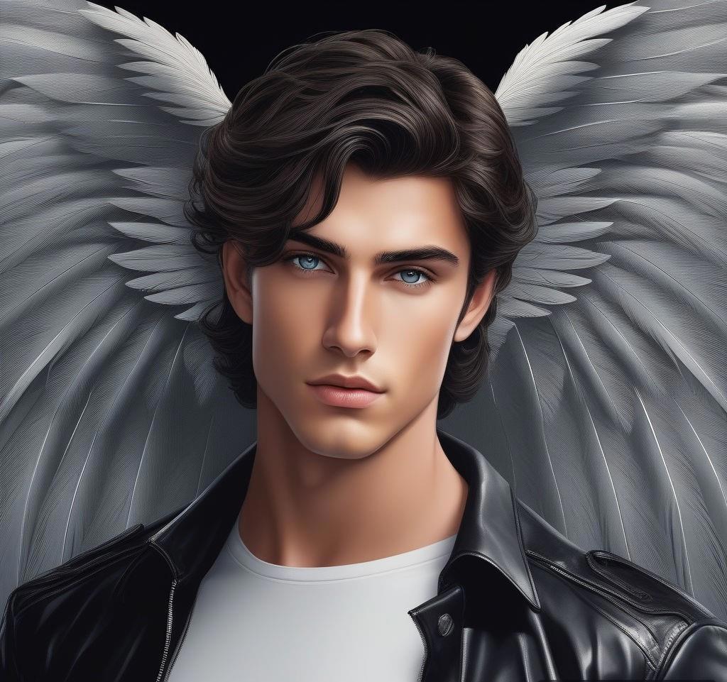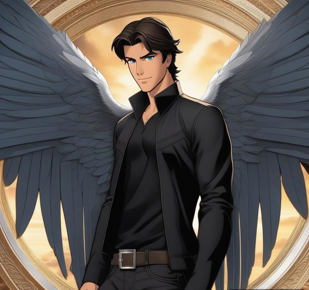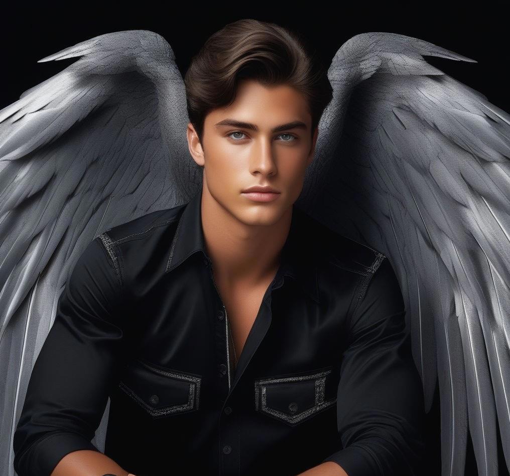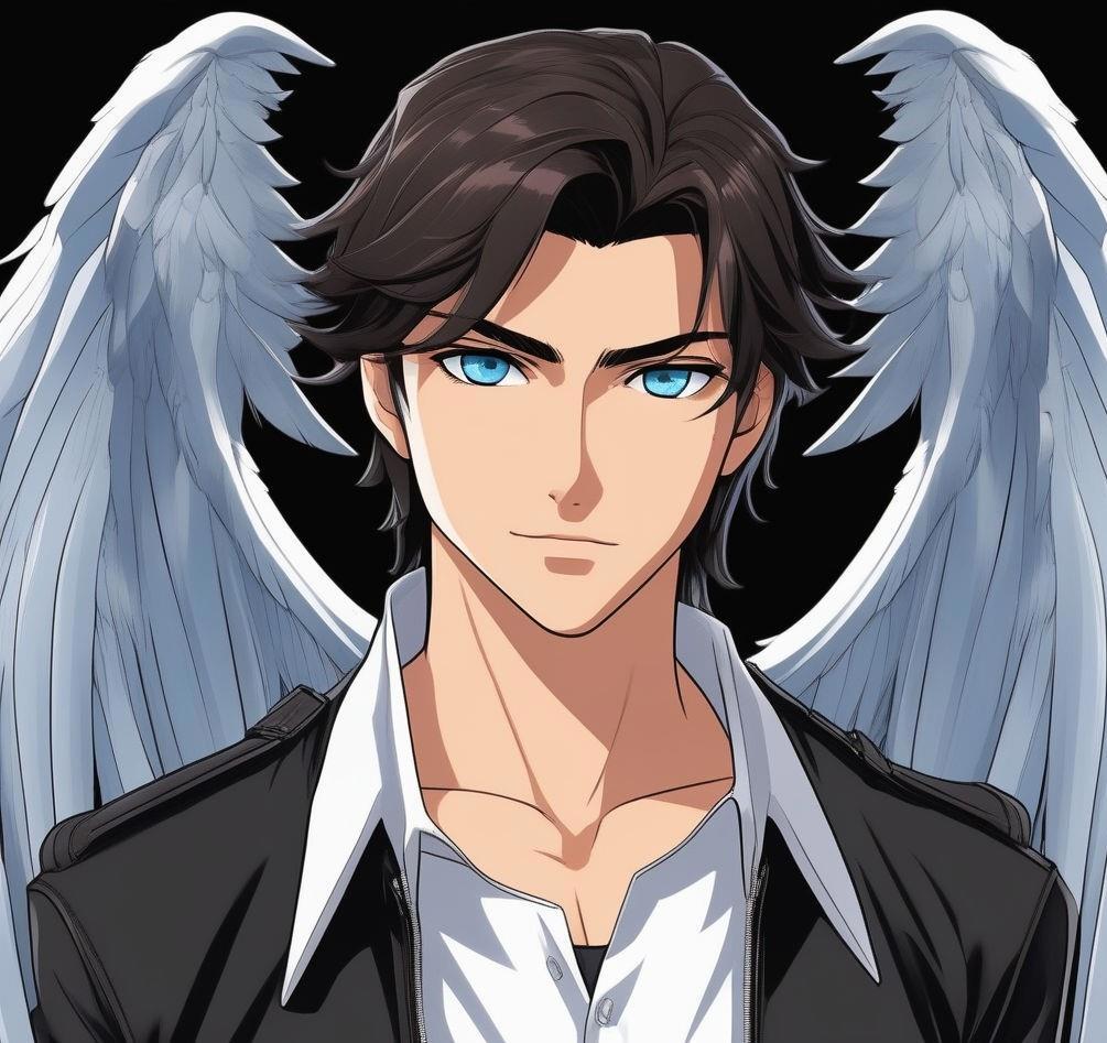 двадцатипятилетний загорелый молодой мужчина с темно-русыми волосами, которые стоят дыбом, овальным лицом, чуть курносым носом и серо-голубыми глазами, одетый в черную рубашку, черные джинсы, высокие шнурованные ботинки. За спиной огромные восемнадцатиметровые серебряные крылья