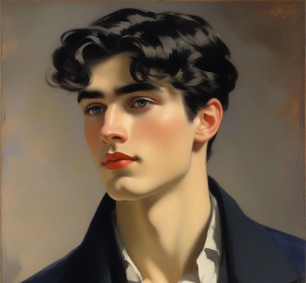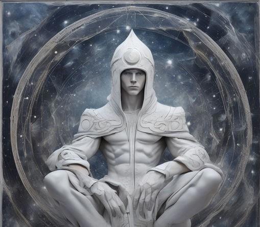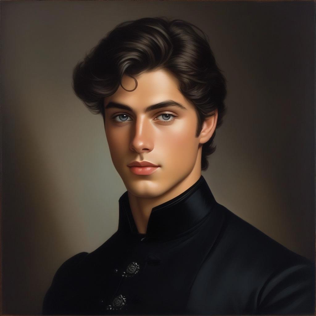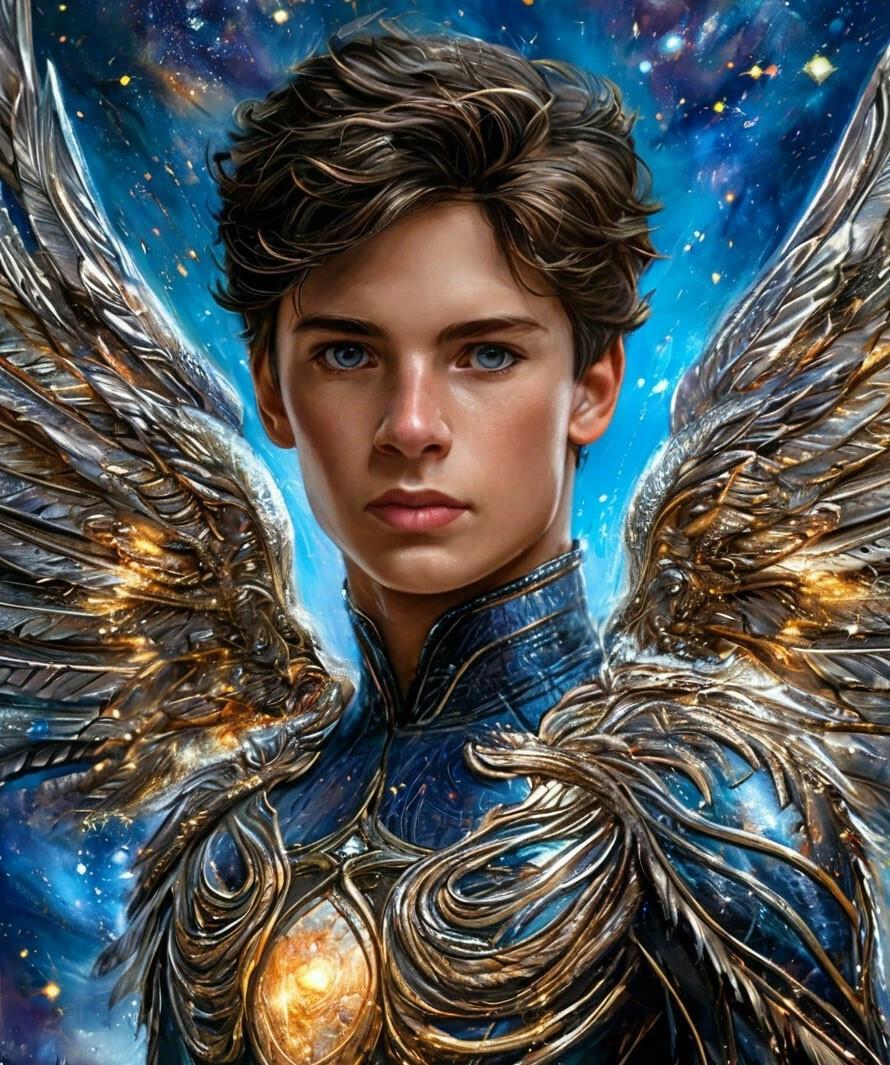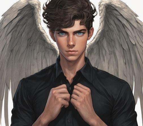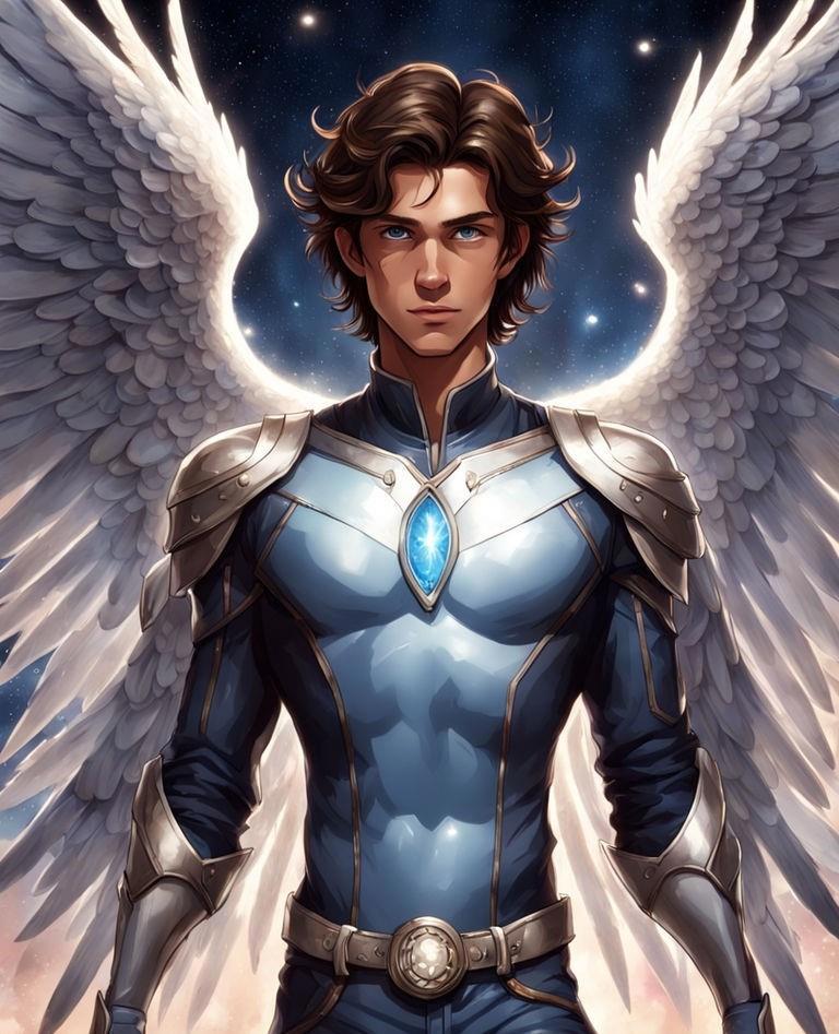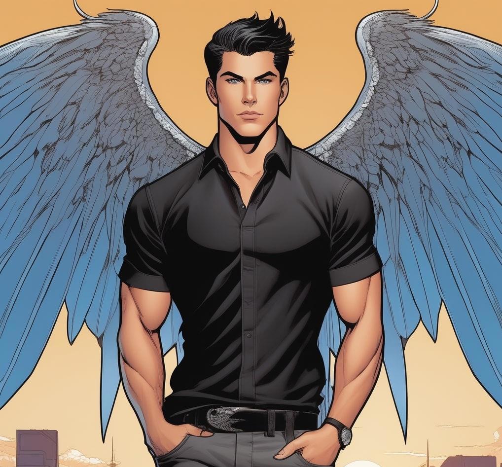 двадцатипятилетний загорелый молодой мужчина с темно-русыми волосами, которые стоят дыбом, овальным лицом, чуть курносым носом и серо-голубыми глазами, одетый в черную рубашку, черные джинсы, высокие шнурованные ботинки. За спиной огромные восемнадцатиметровые серебряные крылья