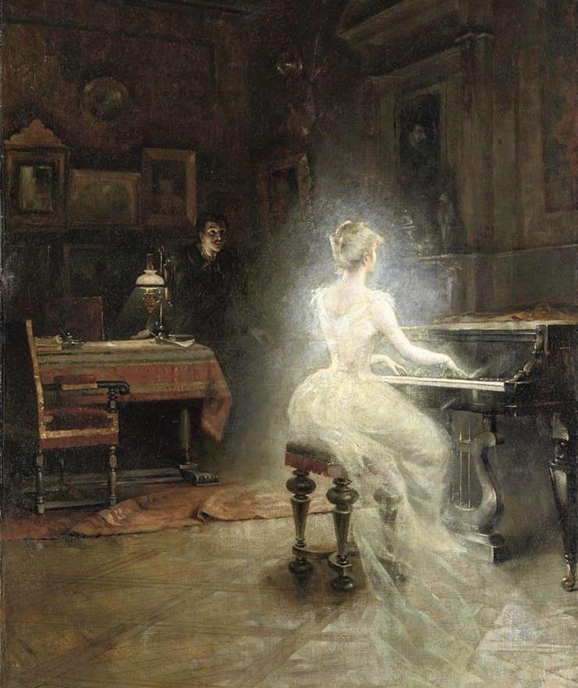Автор: Александр ''Котобус'' ГорбовМолодой пианист потер глаза и поднялся из-за рояля. Спать! Пора уже лечь в постель. Как же он устал! Но зато, отрепетировал всё для выступления. Только он отошел на пару шагов, как услышал за спиной шорох. Возле рояля стоял призрак. Прекрасная сияющая незнакомка, сотканная из лунного света.