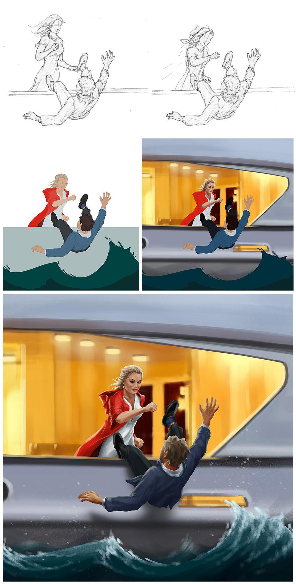 Автор: Салихов ВасильДа-да, именно так! Один удар с подсечкой и парень летит в пучину соленых вод. Сразу скажу, процесс создания иллюстрации был не простым, но жутко интересным. Сама идея изобразить героев из-за пределов основной локации возникла спонтанно, но, как очевидно удачно.