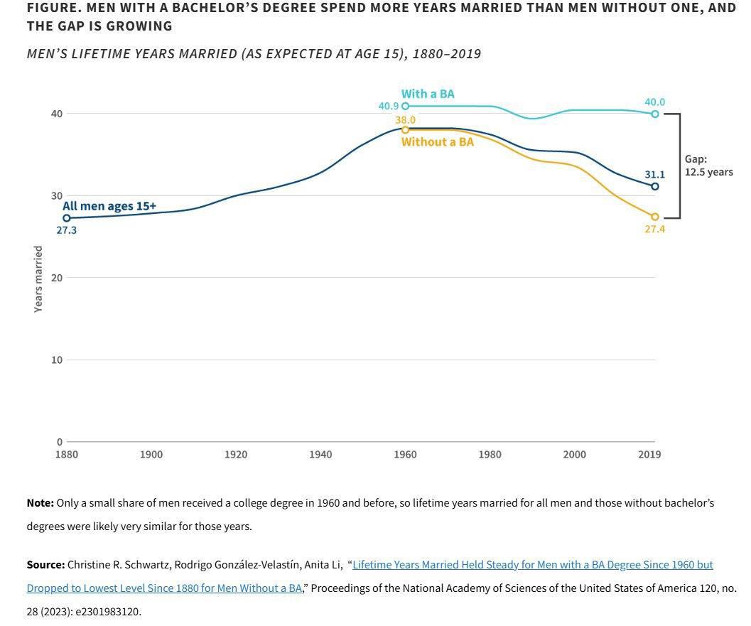 Недавнее исследование в США (https://www.prb.org/articles/the-rise-of-the-no-bachelors-bachelor/) показало, что количество лет, которые мужчины проводят в браке, резко сократилось среди тех, у кого нет высшего образования. В 2019 году мужчины без ВО могли рассчитывать провести в браке 27,4 года своей жизни - это самый низкий показатель с 1880 года и ниже, чем 38,0 лет в 1960 году.