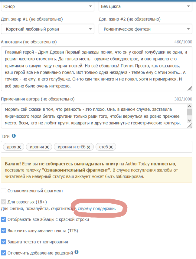 В поле для проблемы я написала в вежливой форме, что прочитав предыдущую редакцию памятки поставила 18+, решив что все требования ужесточились. Но после разъяснений поняла, что вроде как прохожу в не-18+, поэтому прошу убрать отметку.