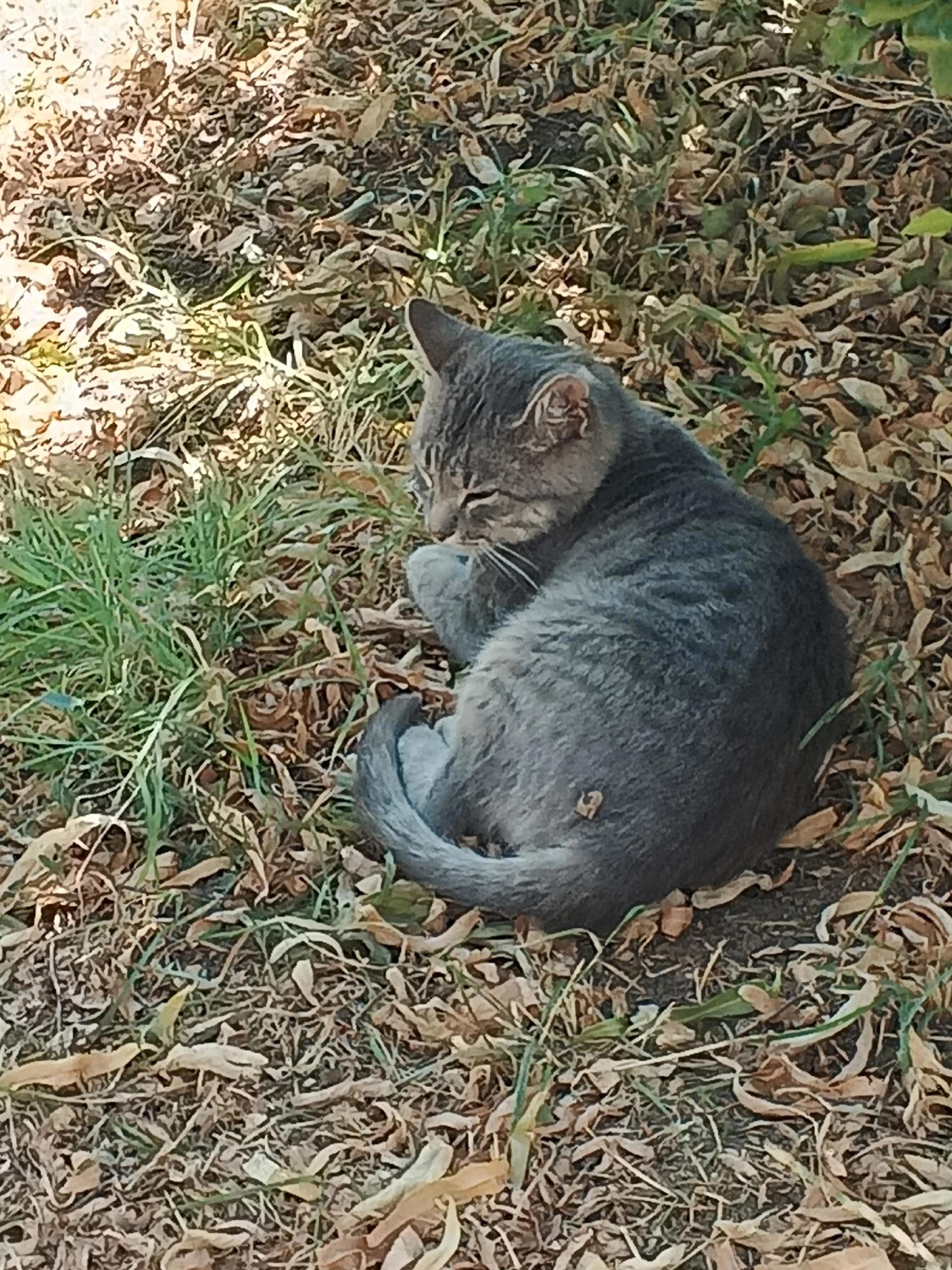 А под кустиком, на тёплой земле, грелась не обращая на нас никакого внимания, совершенно очаровательная киса.