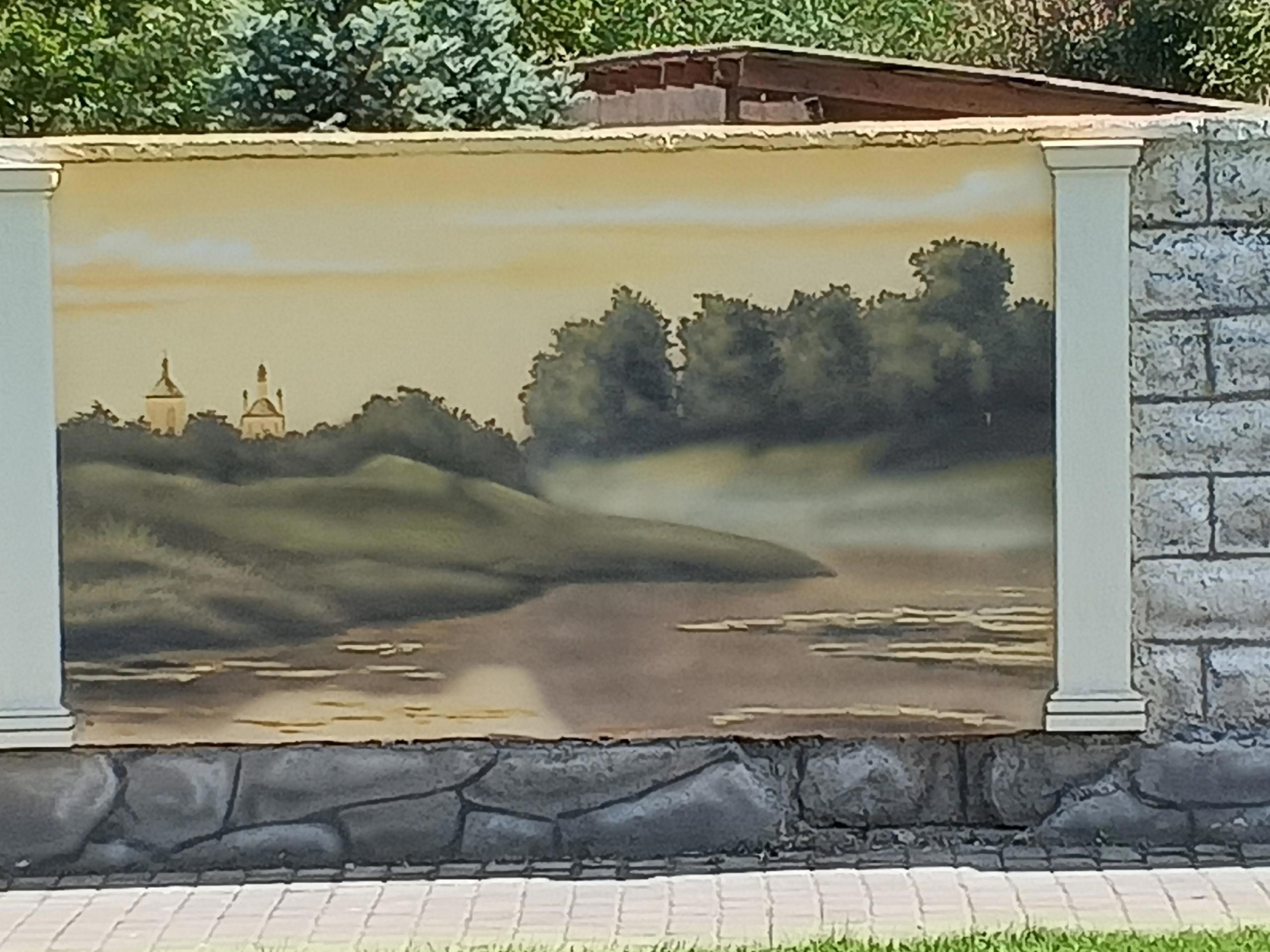 Пока я снимала арку, я не обращала внимания на окружающий пейзаж, а вот потом,ю я вдруг обратила внимание на красоту вокруг. Вокруг великолепные газоны и... явные картины на заборе.